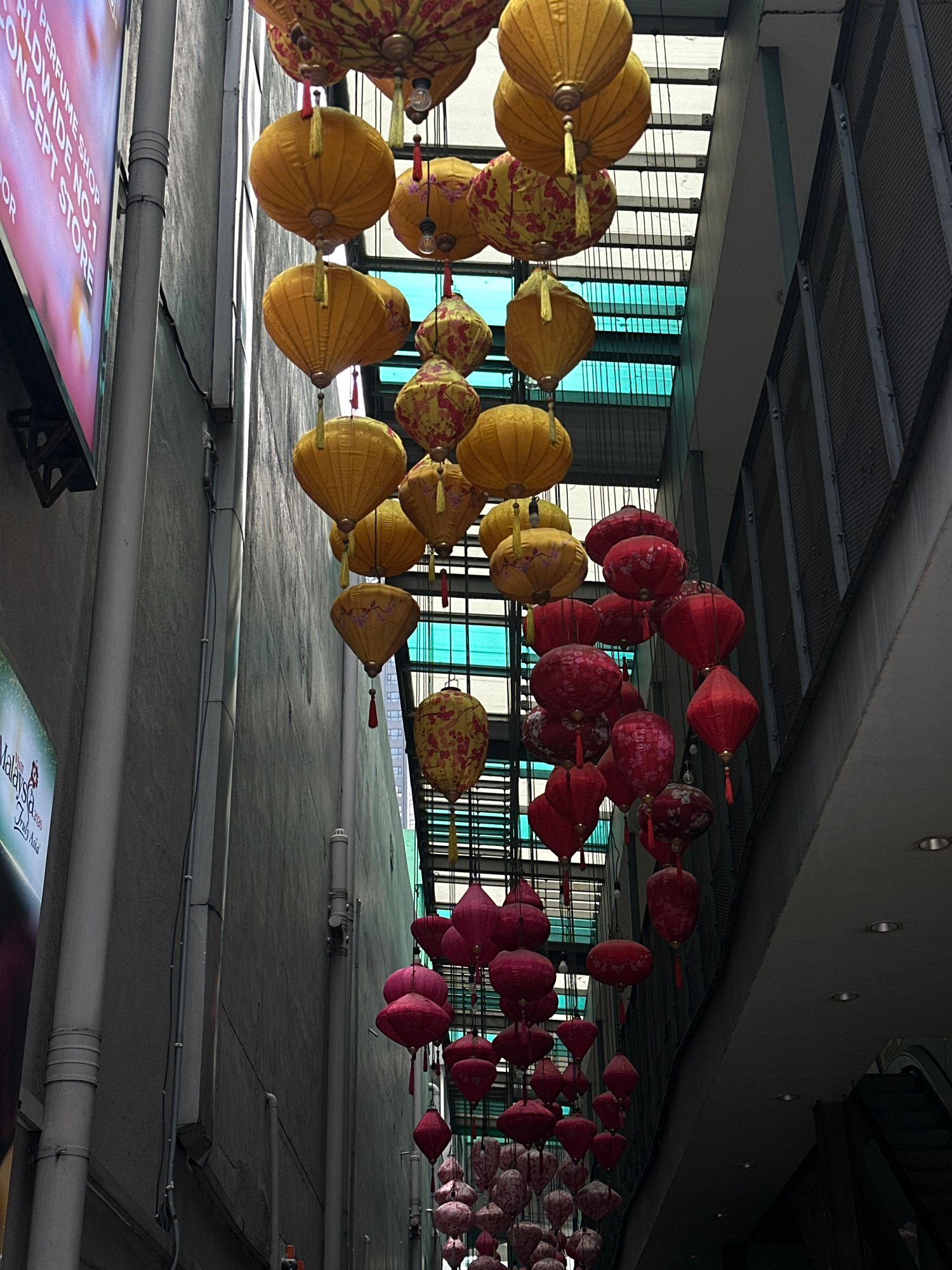 The image shows a collection of hanging lanterns of varying colors (yellow, red, pink) suspended from a ceiling or overhang. They appear to be arranged in rows. Beneath the lanterns, there is an outdo…read more
