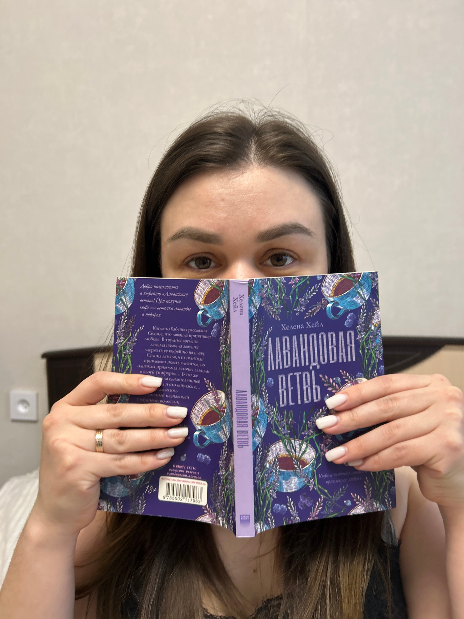 A woman is holding a book up to her face, partially obscuring it. The book is titled "Lavandovaya Vetv" ("Lavender Branch") by Helena Hale, written in Russian. The book cover is purple and features il…read more