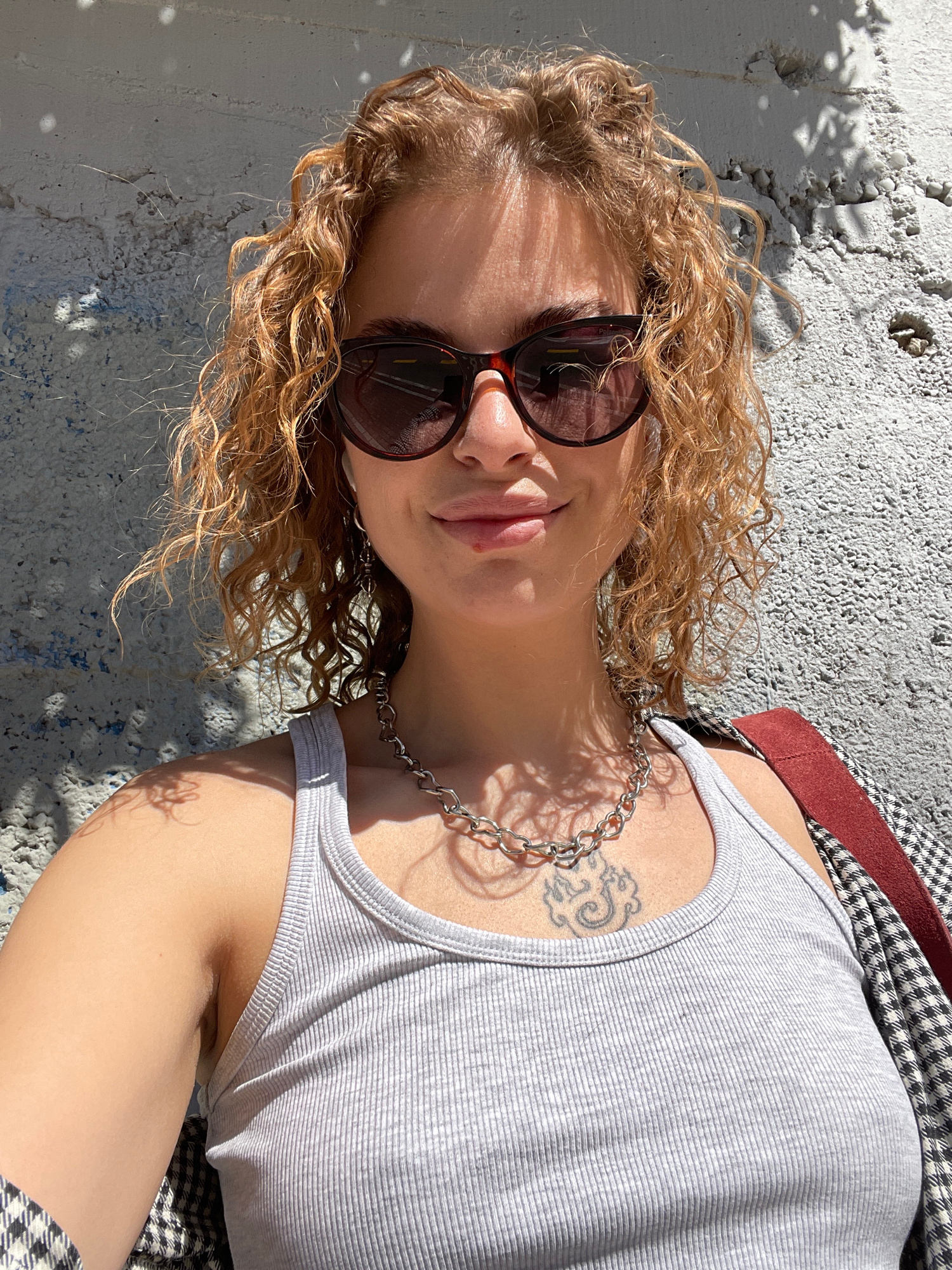 A young woman lies on a concrete surface outdoors, wearing a light gray tank top, a silver chain necklace, and sunglasses. A portion of her checkered jacket is visible. She has curly blonde hair. A ta…read more