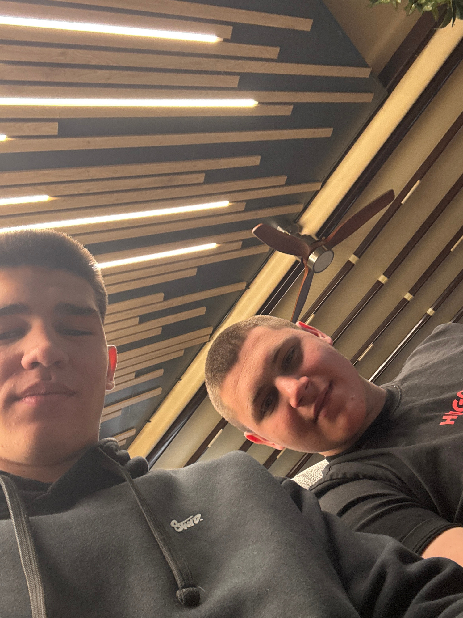 Two men are visible in a vertically oriented photograph. The background features a wall decorated with vertical wooden slats interspersed with linear light fixtures, and a ceiling with linear elements…read more