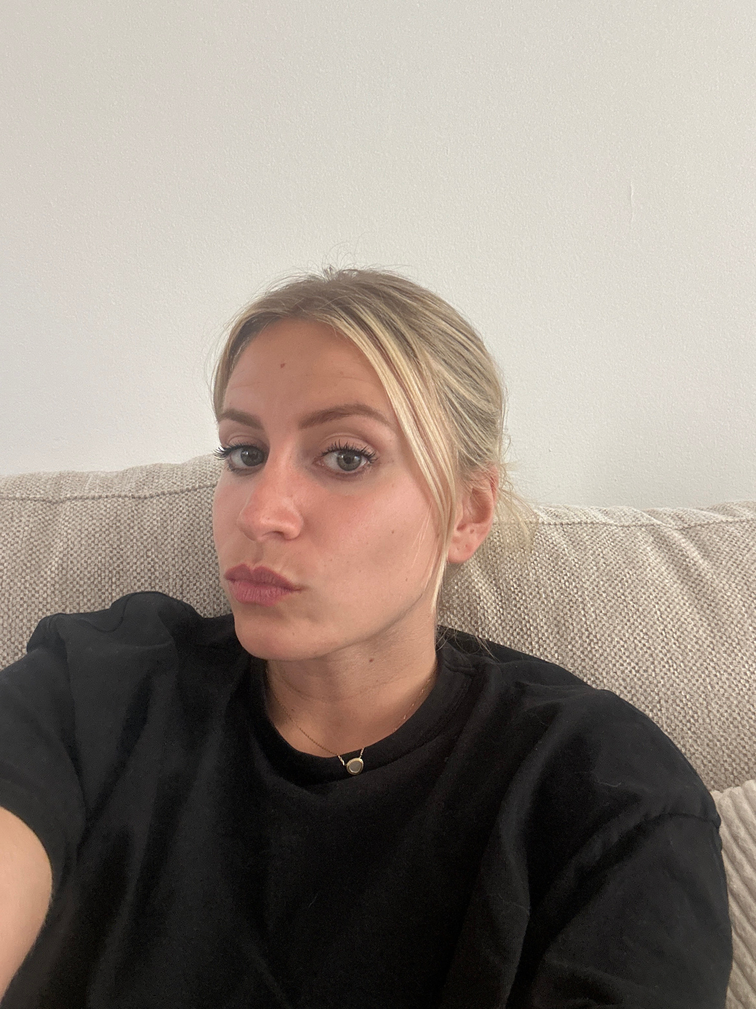 A fair-skinned woman with blonde hair is lying down on a textured, light-colored cushion, possibly a sofa or bed. She is wearing a black t-shirt and a delicate gold necklace. She is looking directly a…read more