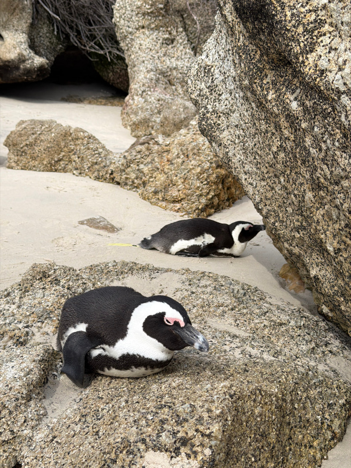The image depicts two African Penguins (Spheniscus demersus) resting on a sandy beach among large granite boulders at Boulders Beach, Simon's Town, South Africa. In the foreground, one penguin is lyin…read more