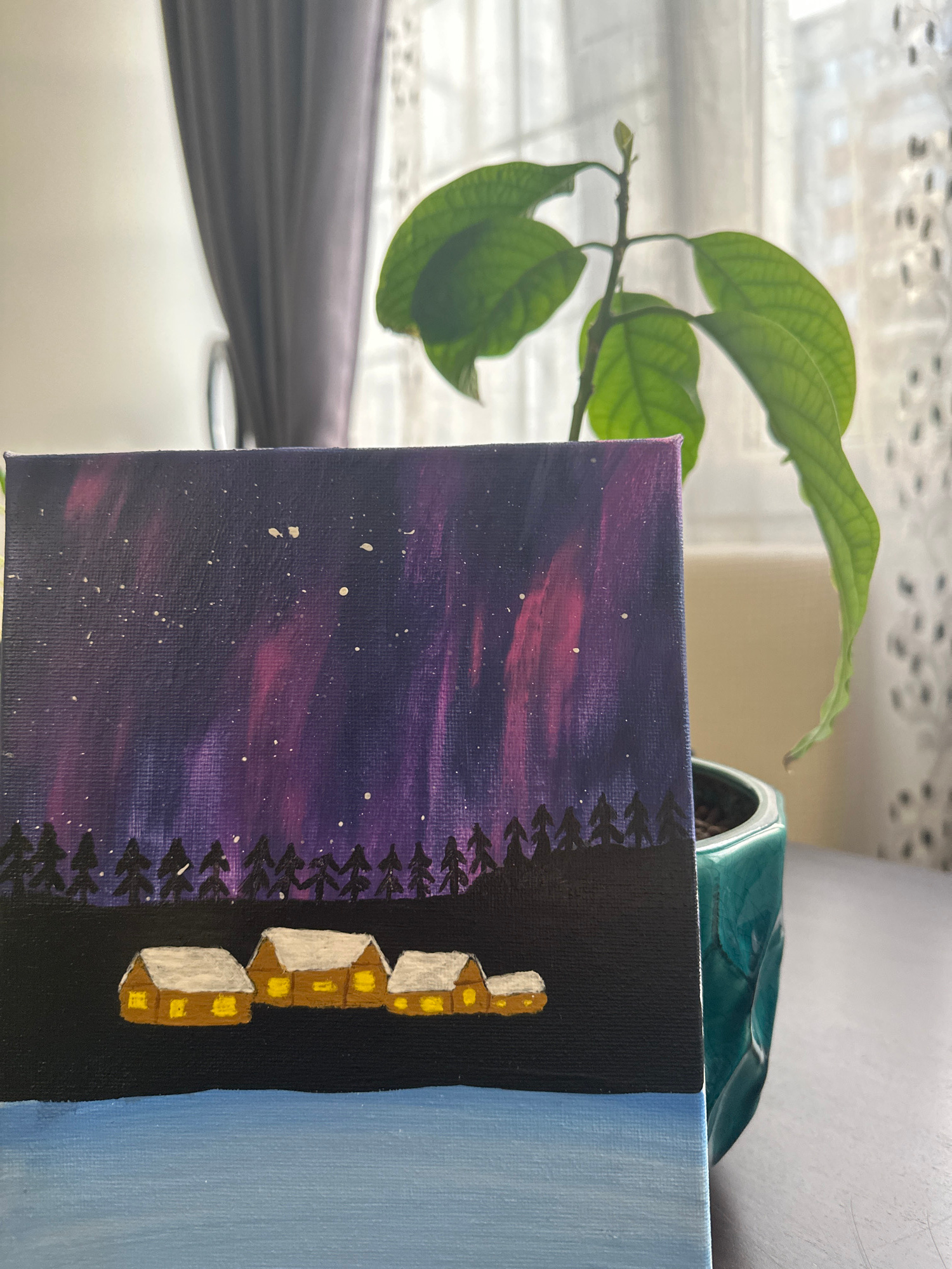 A close-up, slightly angled shot depicts a small, square painting. The painting is divided into three sections: a dark blue-purple section with sparse white speckles suggesting a night sky, a dark sec…read more