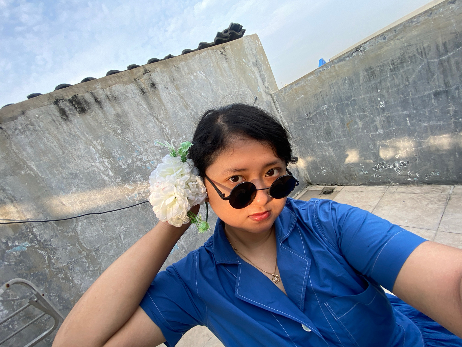 A woman with dark hair and sunglasses is holding white flowers near her head in an outdoor setting. She is wearing a blue collared shirt and a gold necklace with a pendant. The background features wea…read more