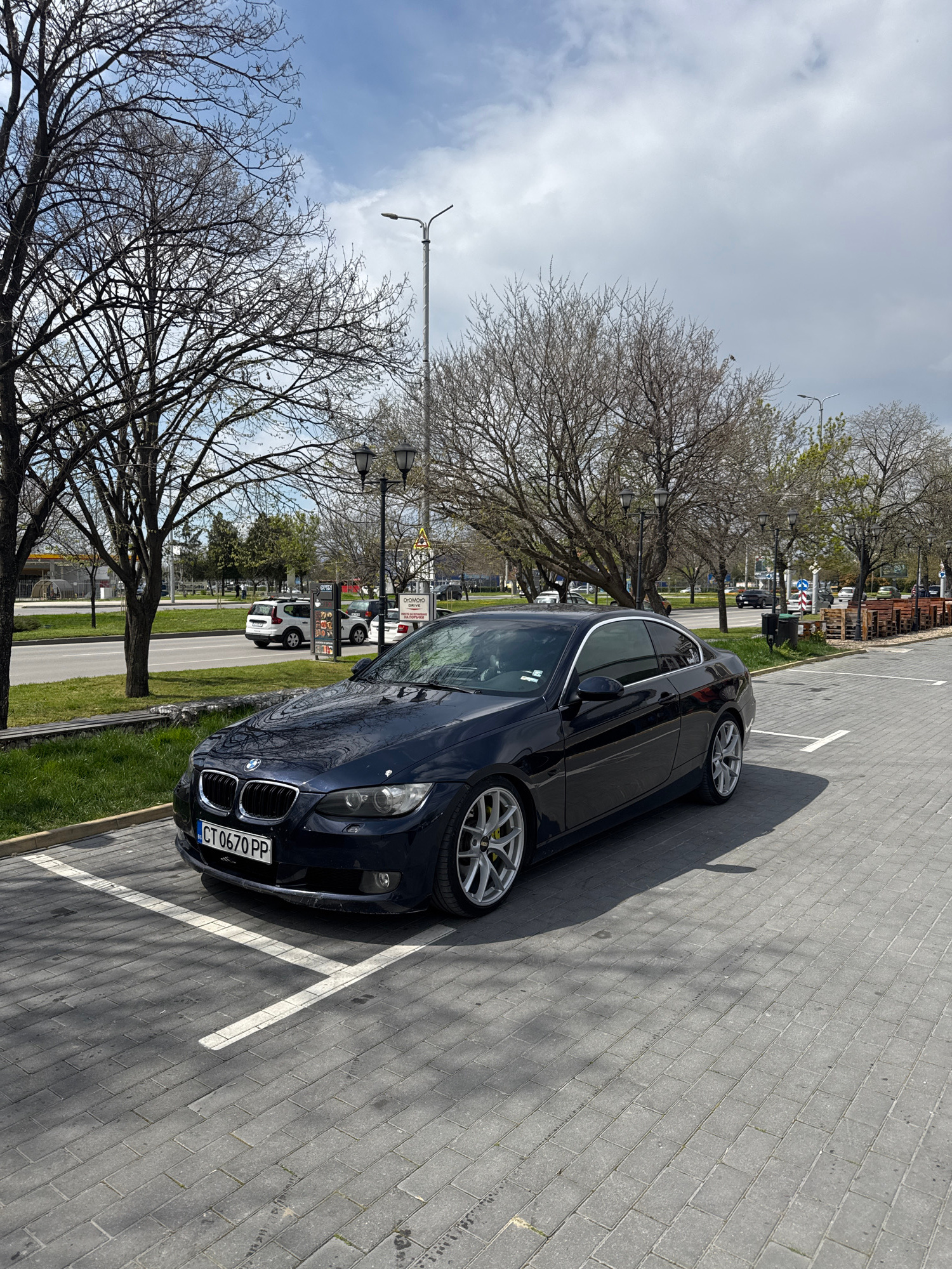 A dark blue BMW car, license plate CT 0670 PP, is parked diagonally in a designated parking space marked with white lines on a gray brick pavement. The car is parked adjacent to a grassy strip separat…read more