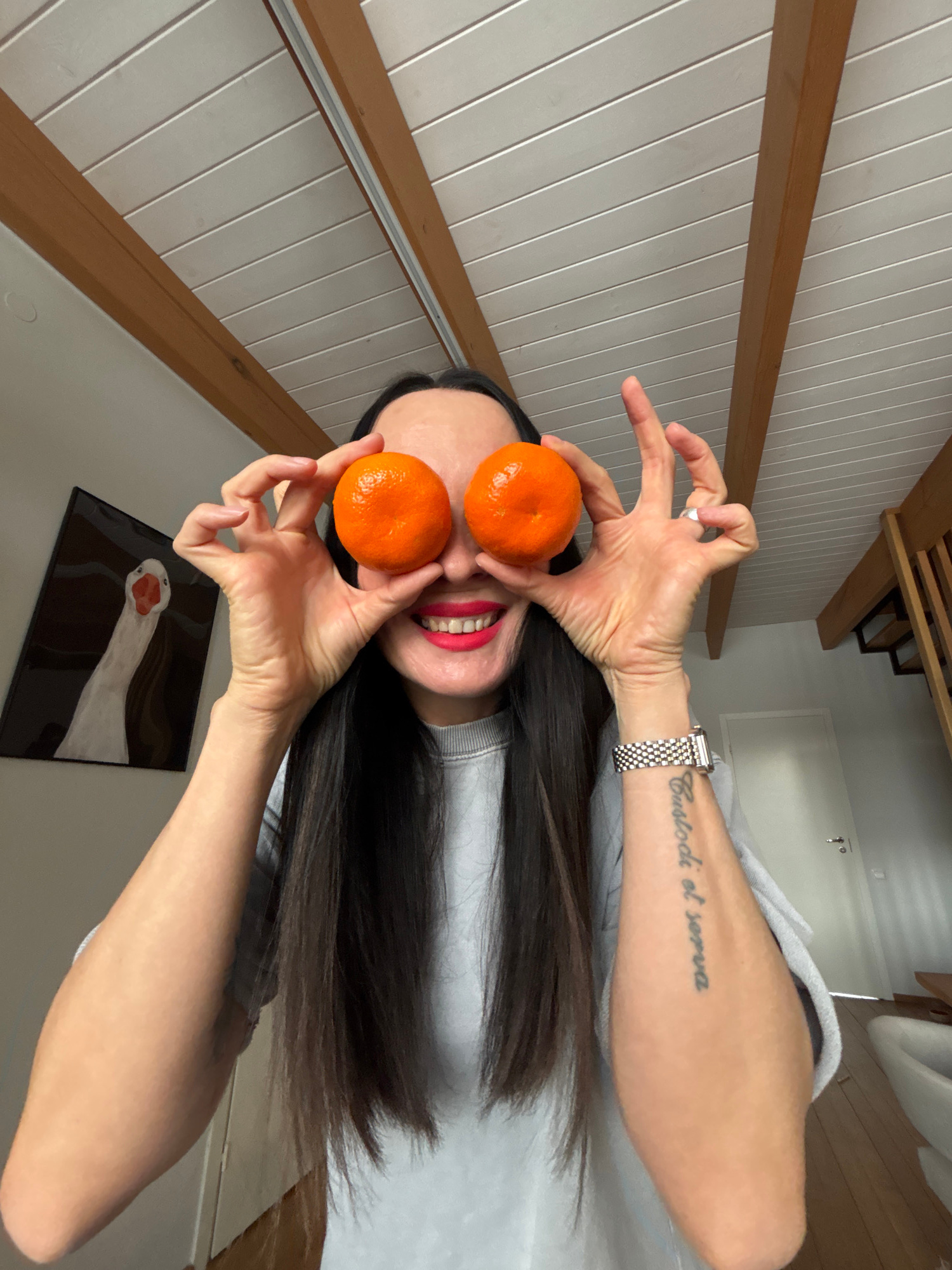 A person is holding two tangerines in front of their eyes. The person has dark hair and is wearing a grey sweater. A watch and a tattoo reading "Custodi et serva" are visible on their left arm. The ba…read more