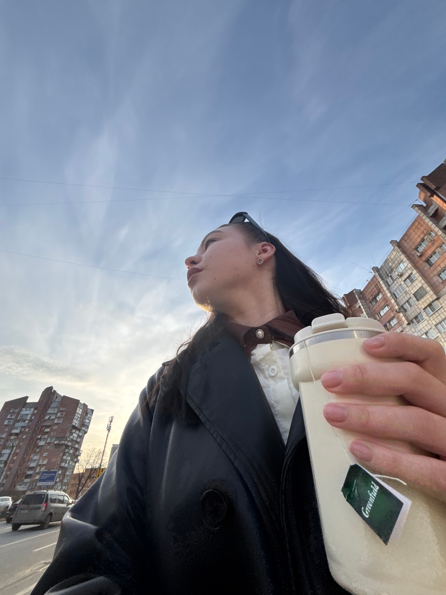 A medium, eye-level shot, tilted to the right, shows a woman holding a beverage container outdoors. The woman, with dark hair pulled back, wears a black leather jacket over a white shirt with brown de…read more