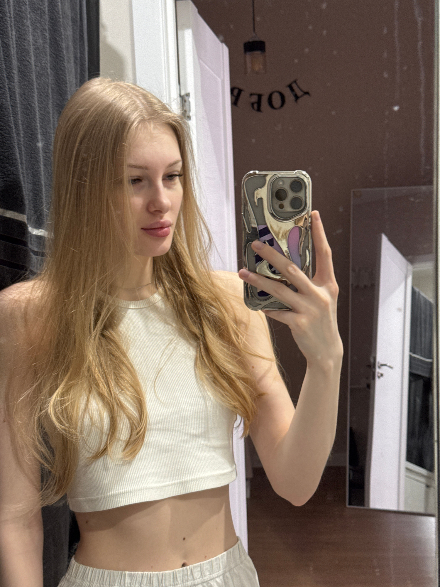 A young woman with long, blonde hair is taking a selfie in what appears to be a bathroom. She is holding a phone with a decorative case up to a mirror, which reflects the room. The background includes…read more