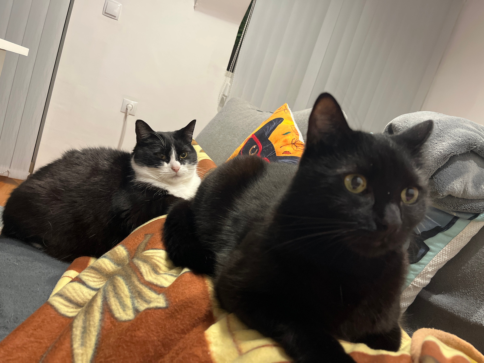 Two cats are resting on a blanket indoors. One is black and white and lying in the background. The other cat is all black, and is in the foreground. An orange pillow with a black cat silhouette is beh…read more