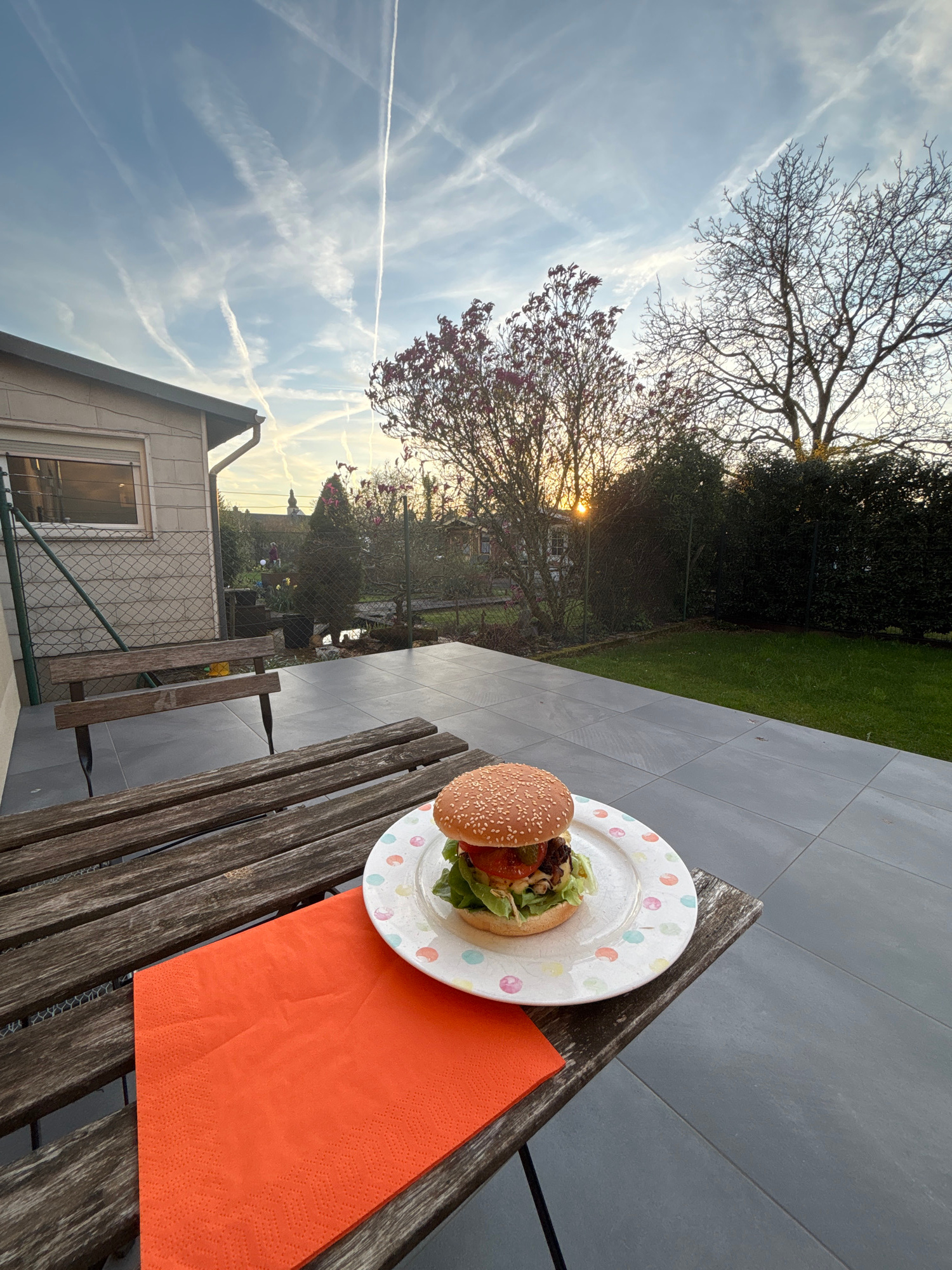 The image shows a hamburger on a plate, placed on a wooden table with an orange napkin. The table is situated on a tiled patio. In the background, there is a view of trees, a building with a window, a…read more