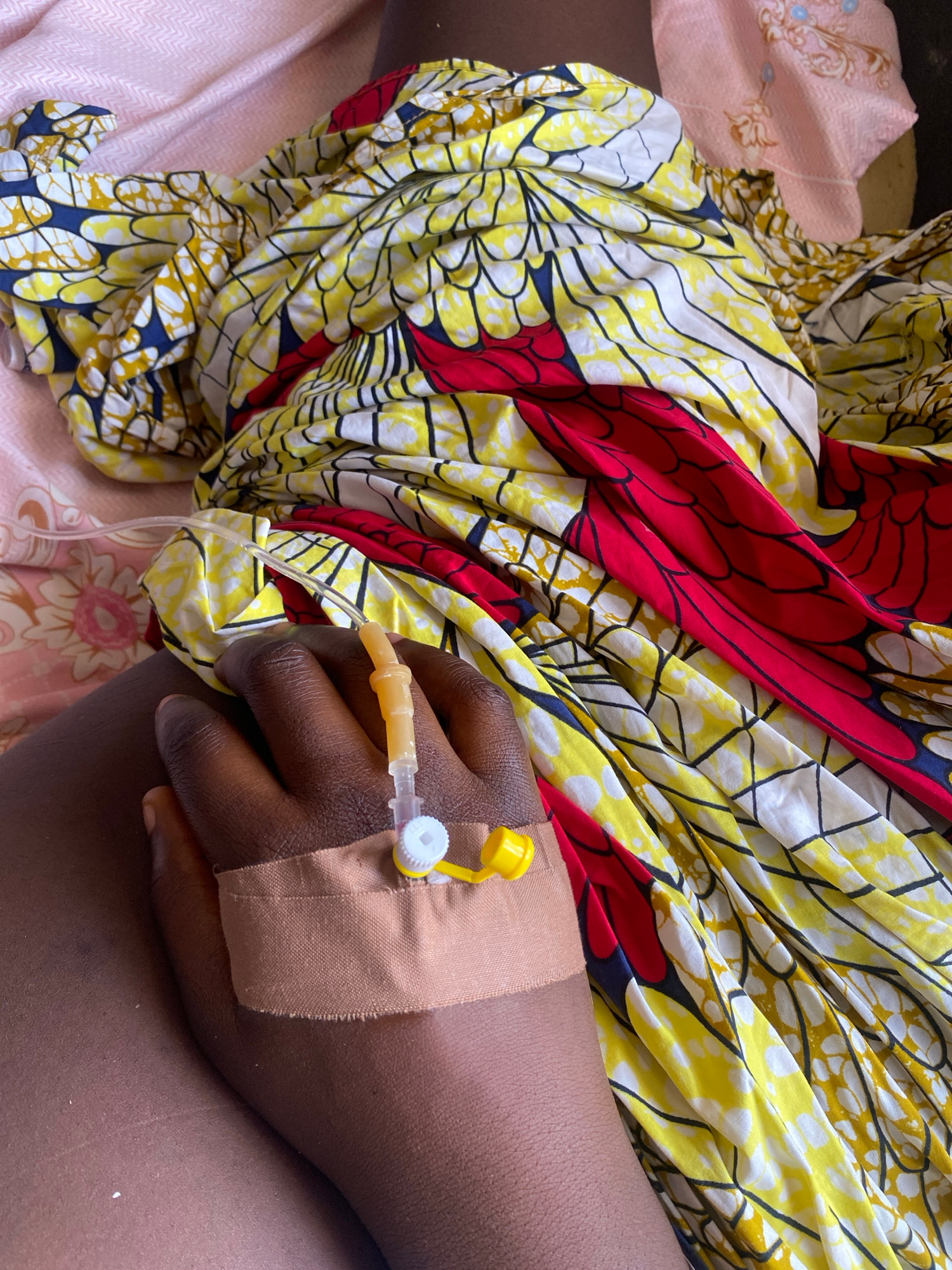 An arm with an IV in a brown-skinned arm in Rido, Nigeria. The IV is attached to the back of the hand with medical tape and a yellow cap. The person is lying down, covered with a colorful red, yellow,…read more