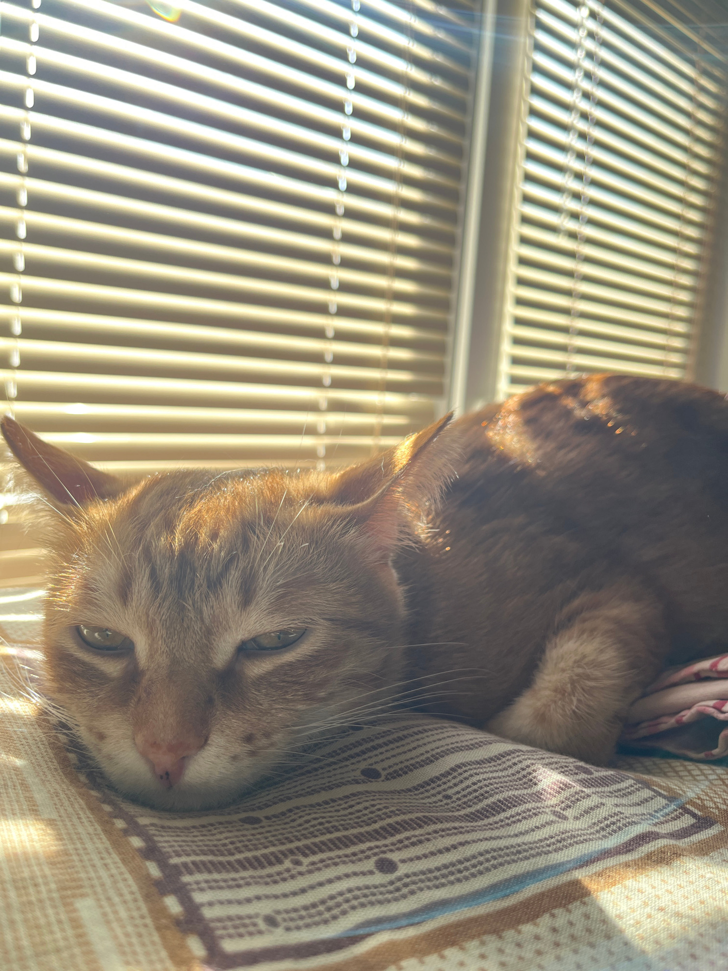 An indoor shot from an overhead angle depicts an orange tabby cat resting on a patterned fabric. The cat's face is close to the camera, with visible eyes, nose, and whiskers. The background includes t…read more