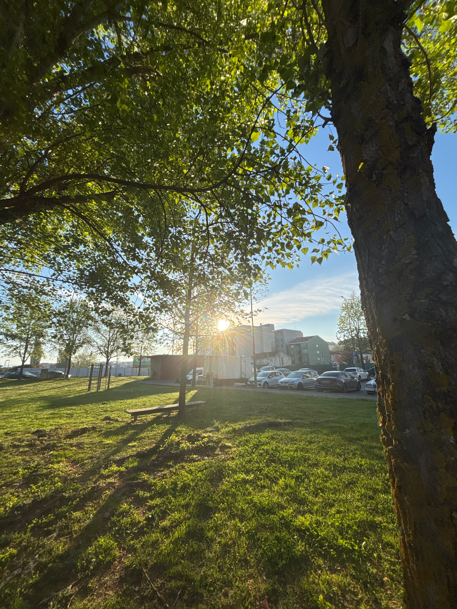 The image depicts a sunlit park scene in Mirandela, Portugal, viewed through a natural frame formed by tree branches. The right side of the image contains a large tree trunk. The park has a green lawn…read more