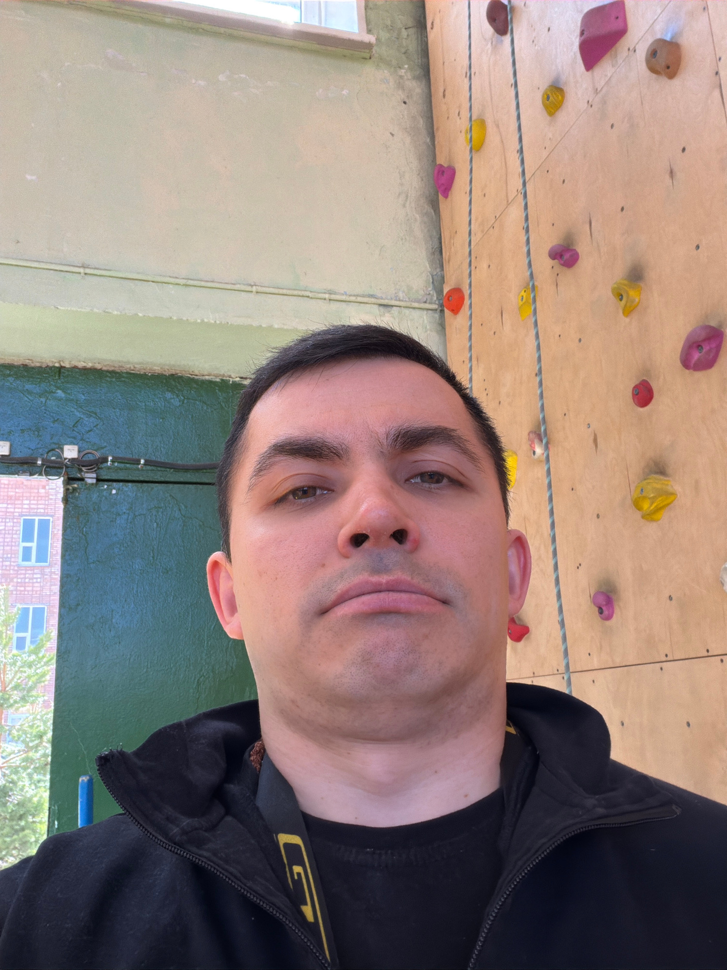 A selfie of a man in front of an indoor climbing wall is shown. The climbing wall has various colored holds. The man is wearing a black jacket. Outside the building is a glimpse of another building wi…read more