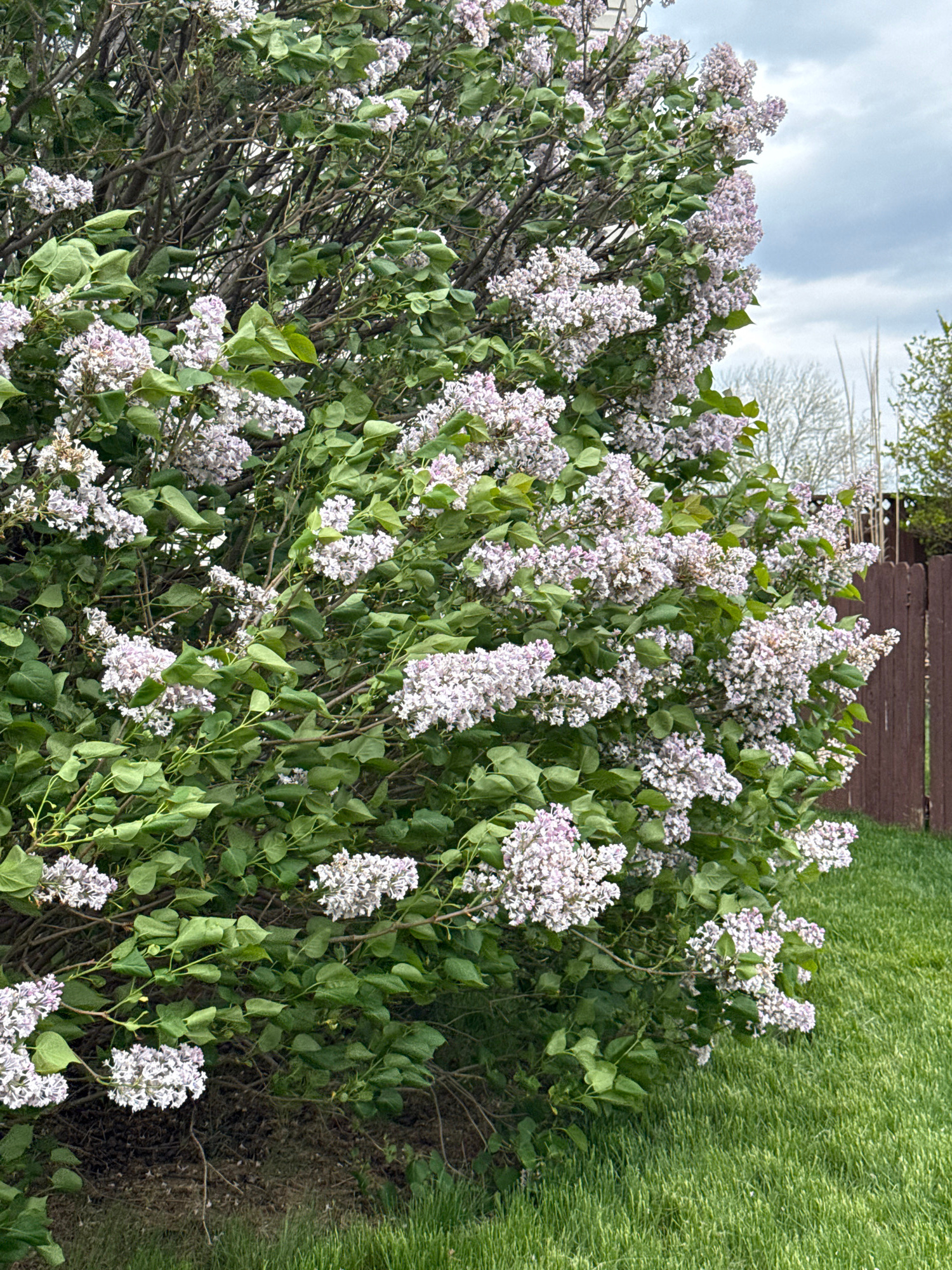 The image shows a lilac bush in full bloom. The bush is covered in clusters of light purple and white flowers, with green leaves interspersed. To the right of the bush is a patch of green grass. In th…read more