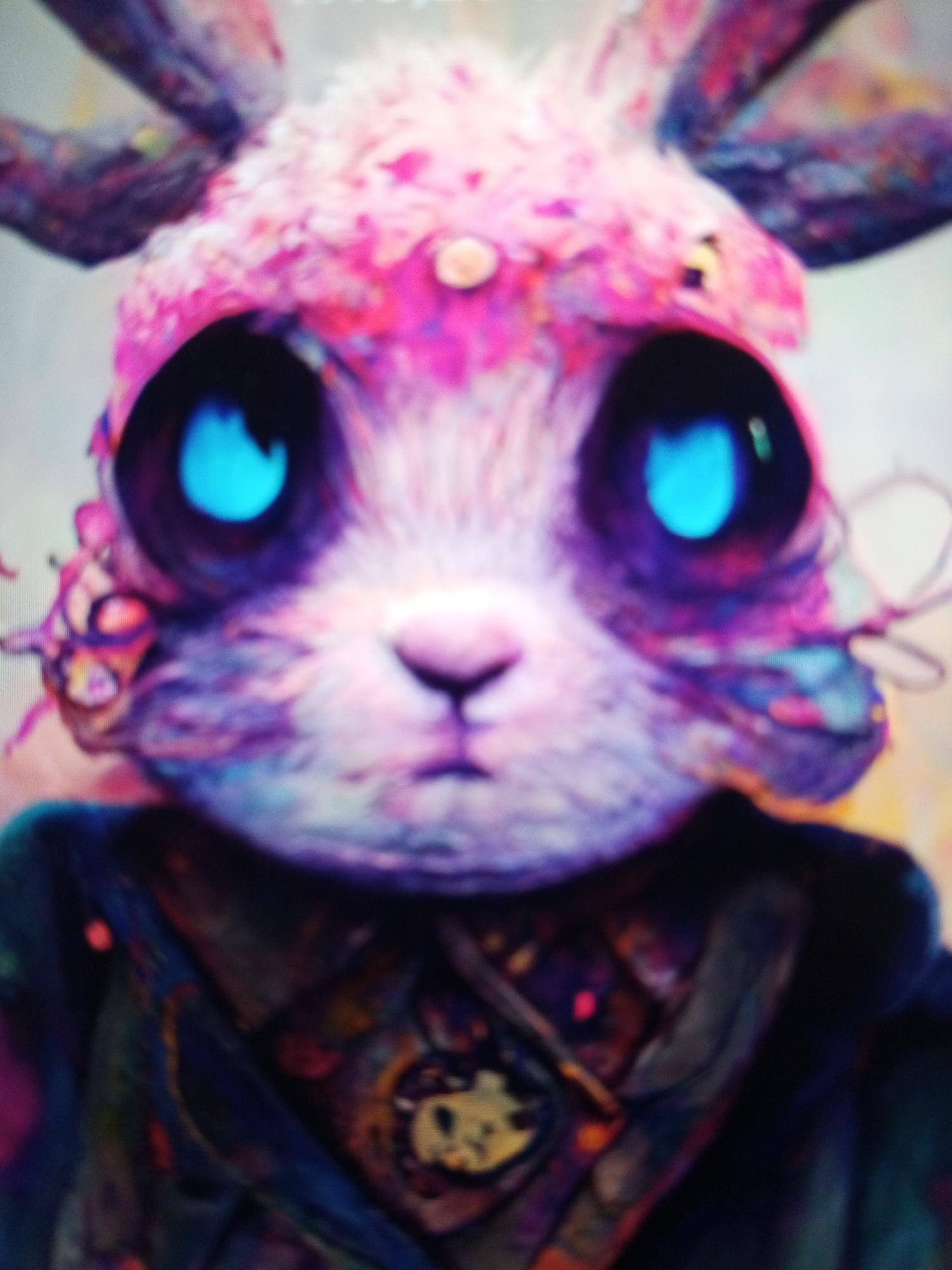 A digitally rendered, close-up portrait showcases a fantastical creature resembling a rabbit or deer-like being, centered in the frame. The creature's head is adorned with vibrant shades of pink and p…read more