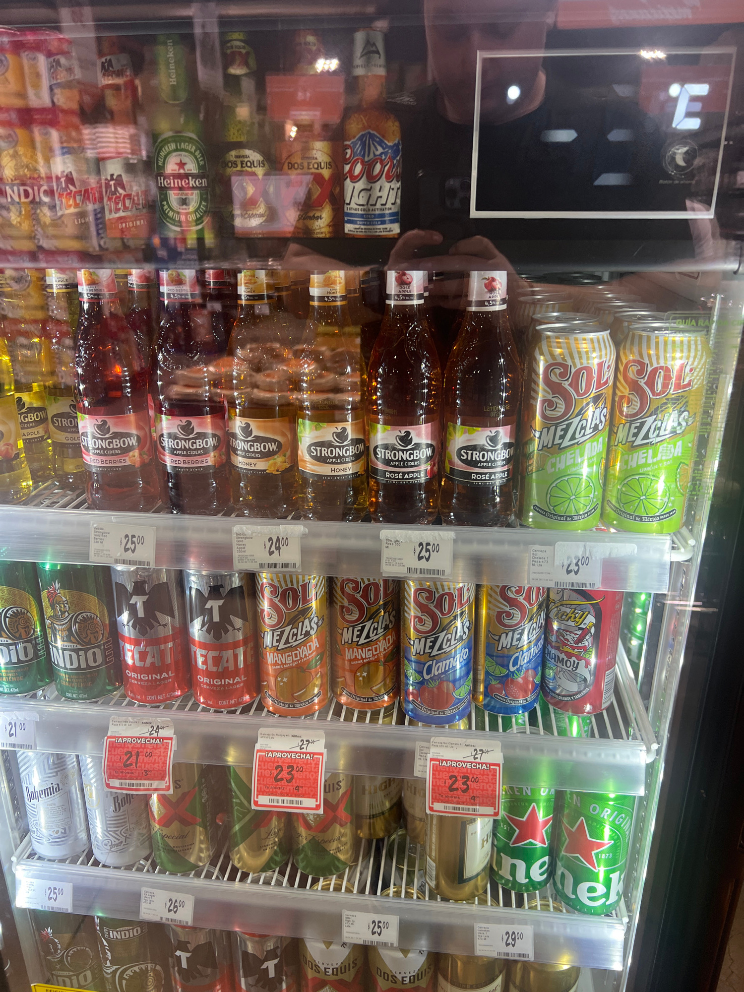 The image depicts a refrigerator shelf in a retail establishment, most likely in San Pedro Cholula, Mexico, stocked with various alcoholic beverages. Prominent brands visible include Sol Mezclas in va…read more