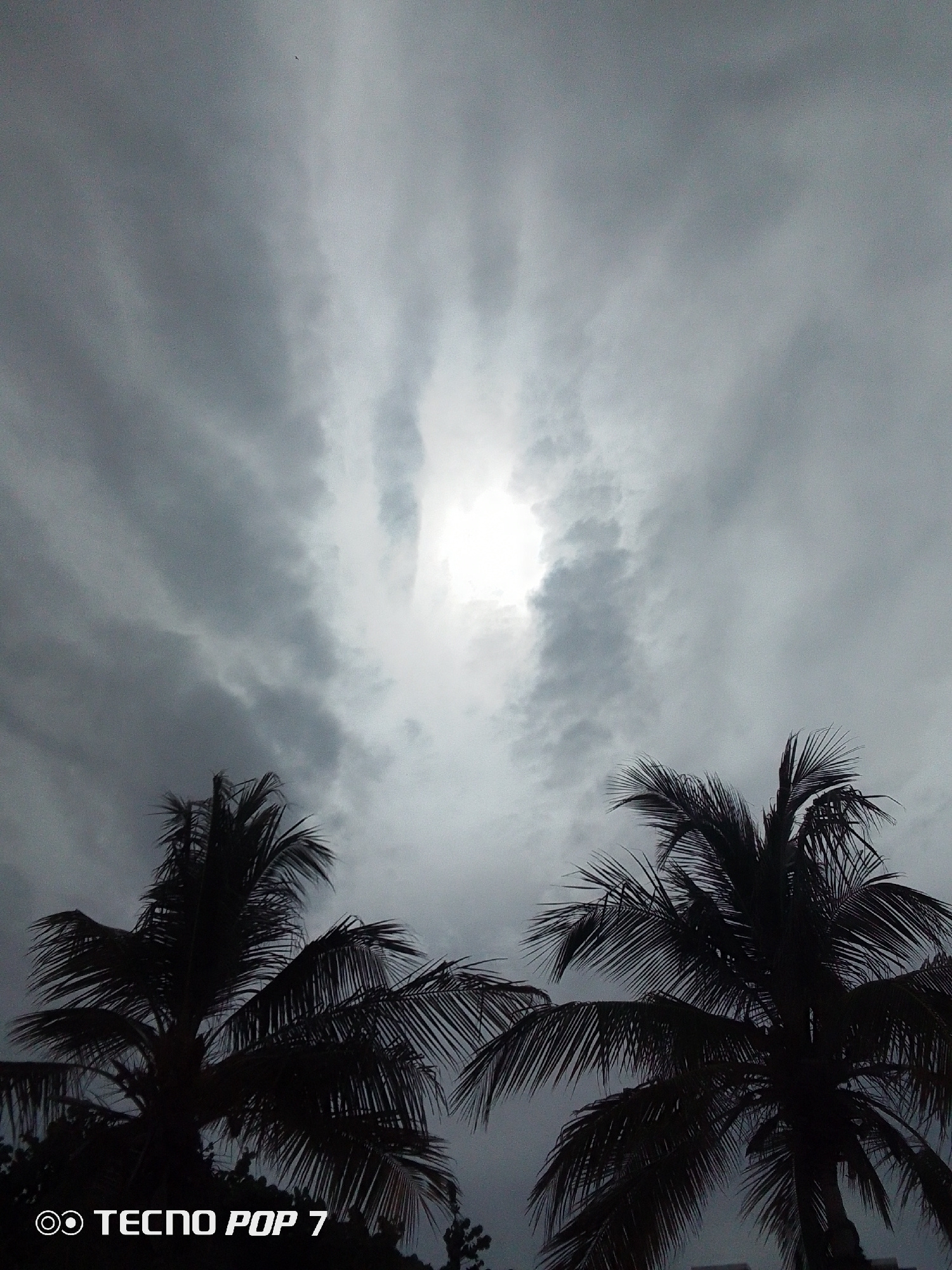 The image captures a view of the sky dominated by dark, overcast clouds, with a bright area indicating the sun struggling to break through. The silhouettes of two palm trees frame the bottom of the im…read more