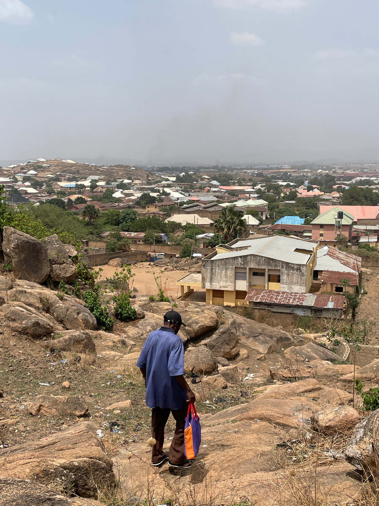 A slightly tilted, eye-level, outdoor shot in daylight depicts an African man on a rocky hillside overlooking a cityscape, which is located in the city of Jos, Nigeria. The man is wearing a navy-blue…read more