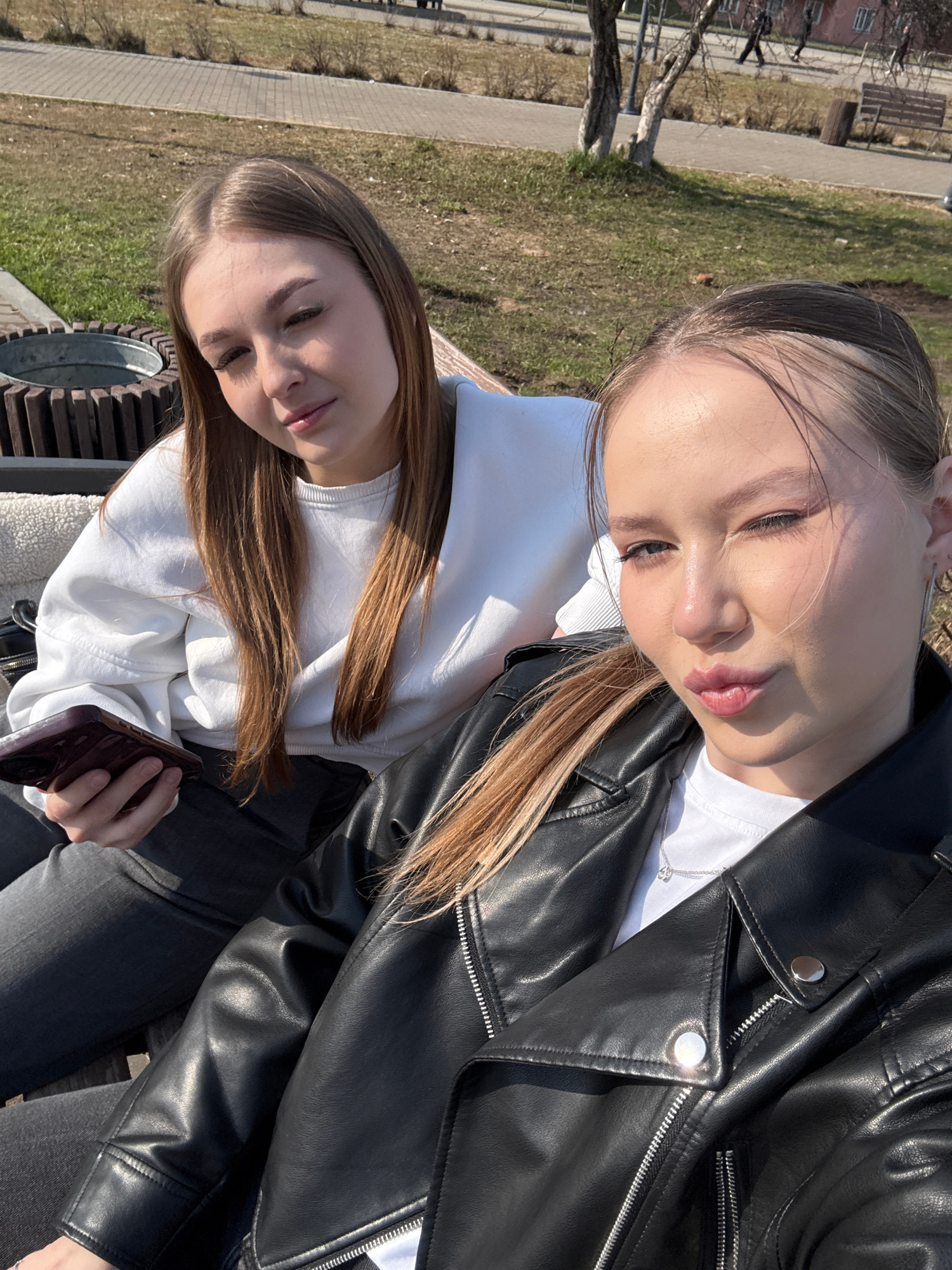Two young women are sitting outdoors on a park bench. One woman, wearing a white sweatshirt, sits on the left side, holding a cell phone in her left hand. The other woman, wearing a black leather jack…read more