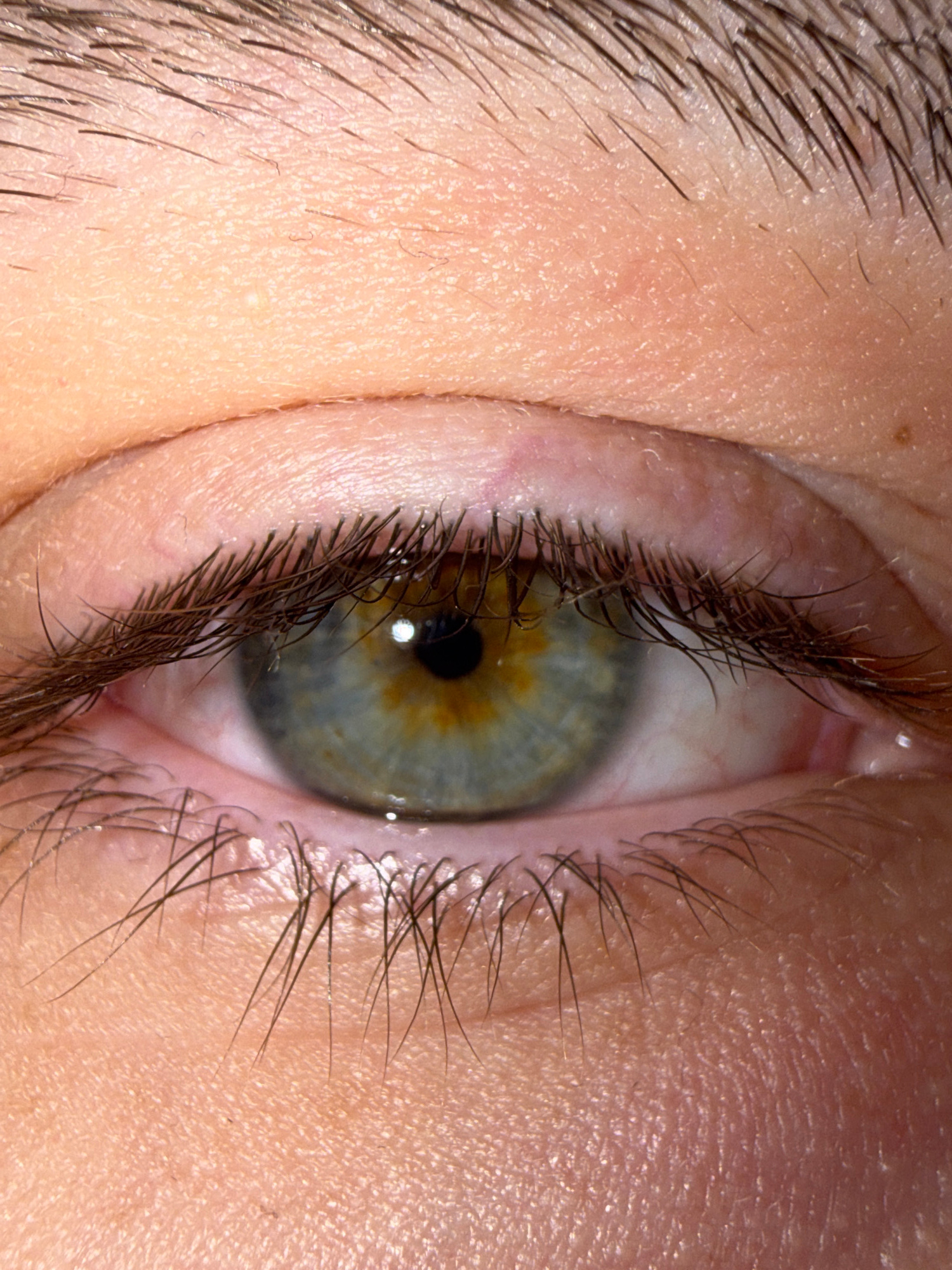 A close-up photograph shows a human eye. The iris is a mix of green and gold, with a dark pupil in the center. Eyelashes are visible along the top and bottom eyelids. Skin texture is prominent around…read more
