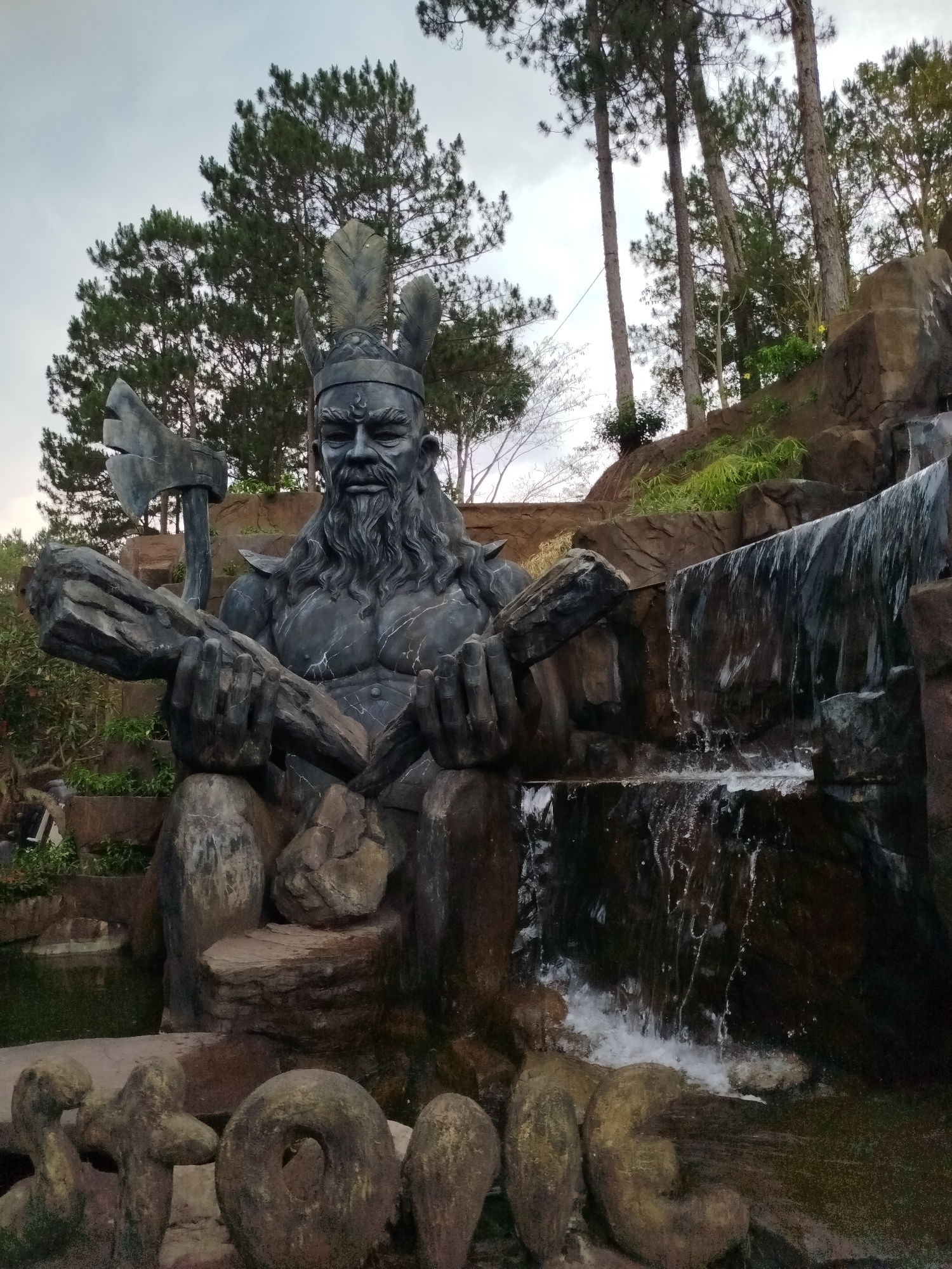 A statue of a bearded man, possibly of Viking or Native American descent, is the focal point of the image. The statue is made of a dark material, perhaps stone or dark-painted concrete, and depicts a…read more