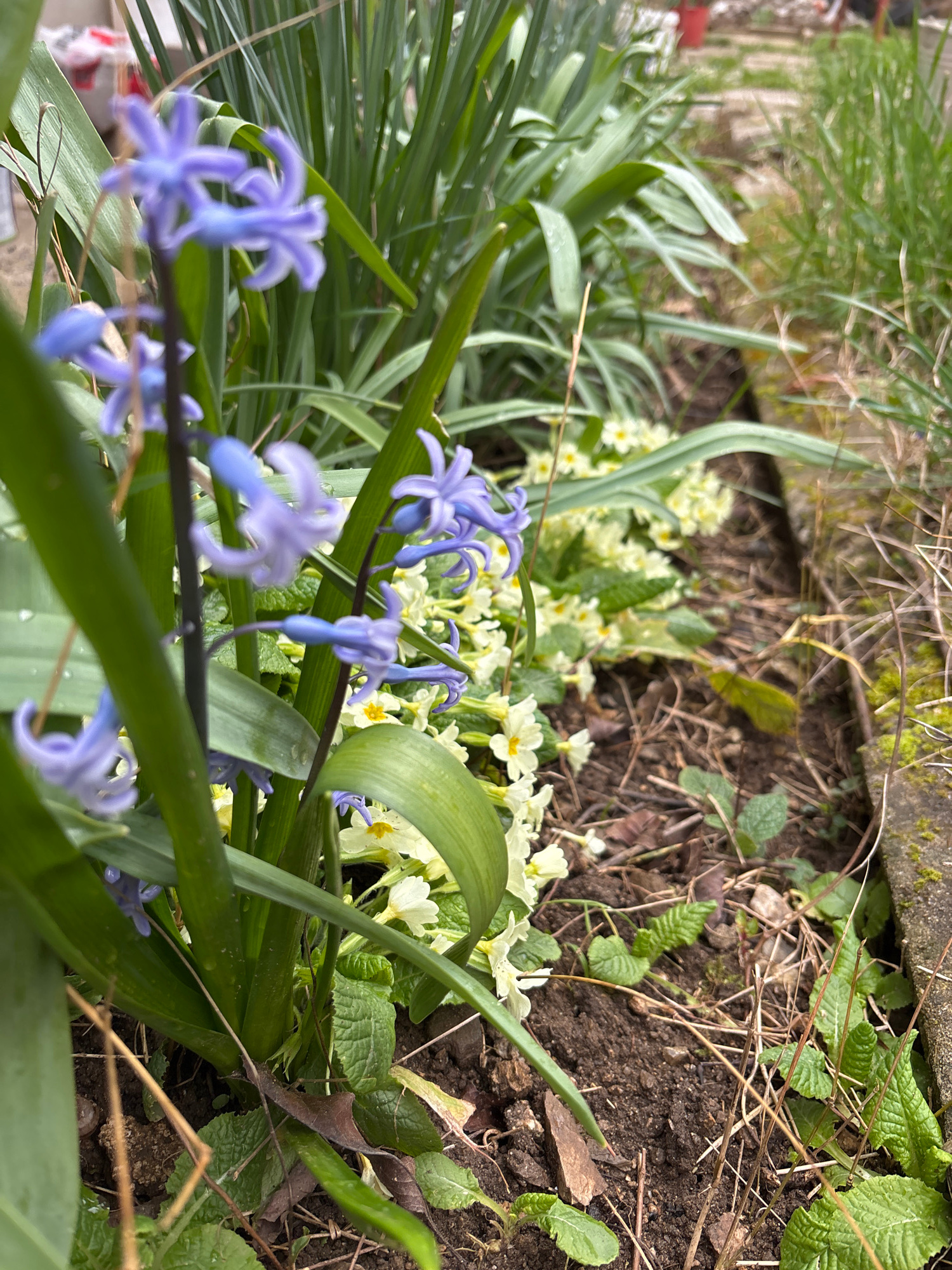 The image displays a close-up view of a garden area located in Zlatograd, Bulgaria. The foreground, positioned on the left, features several stalks of light purple-blue, bell-shaped flowers, likely Sc…read more