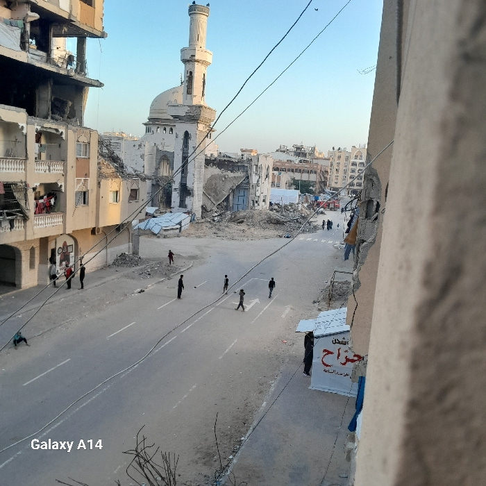 The image displays a damaged urban streetscape in Khan Yunis, Palestinian Territory, observed from an elevated vantage point, likely during morning or late afternoon. A prominent mosque with a minaret…read more