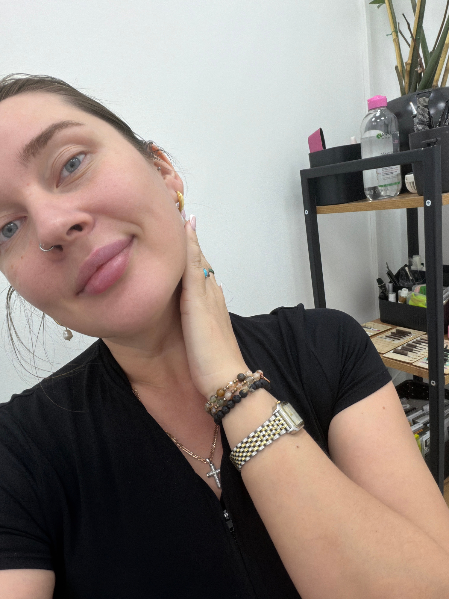 A selfie of a young adult female with fair skin and light blue eyes is visible, taken indoors. She has pierced ears and a nose ring and is wearing a black top. She is wearing a watch and bracelets on…read more