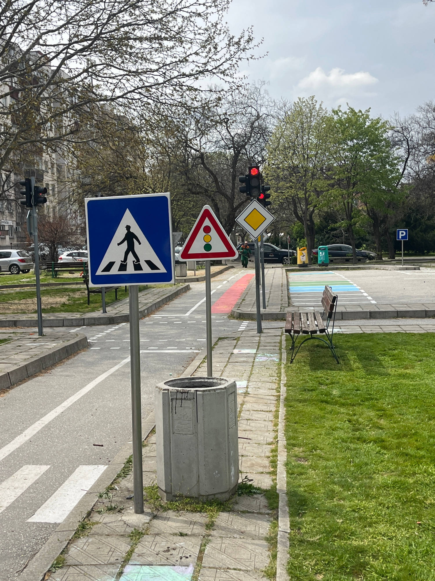 The image depicts a section of a street designed for traffic education in the city of Plovdiv, Bulgaria. The street is lined with sidewalks and has various traffic signs posted along the side. A pedesβ¦read more