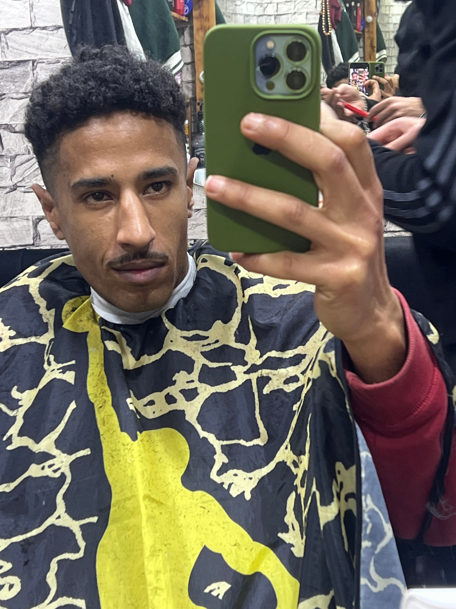 A man with dark, curly hair and a mustache is taking a selfie with a green iPhone in a barber shop. He is wearing a barber's cape that is black with yellow and white abstract designs. He is in a barbeβ¦read more