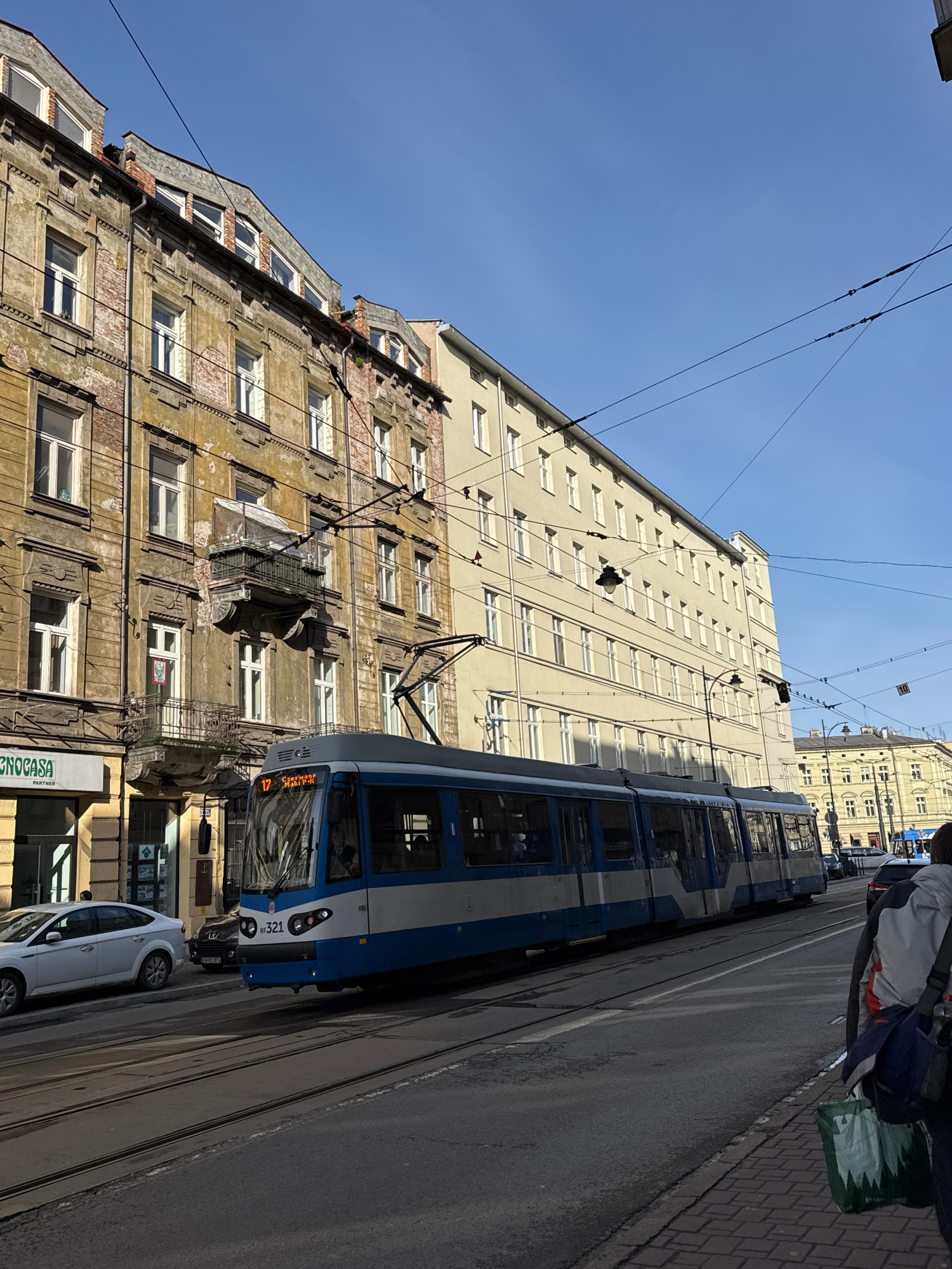 The image shows a street scene in Krakow, Poland, featuring a blue and white tram traveling on rails along the road. The tram displays the number 17. Alongside the tram is a white car parked on the st…read more