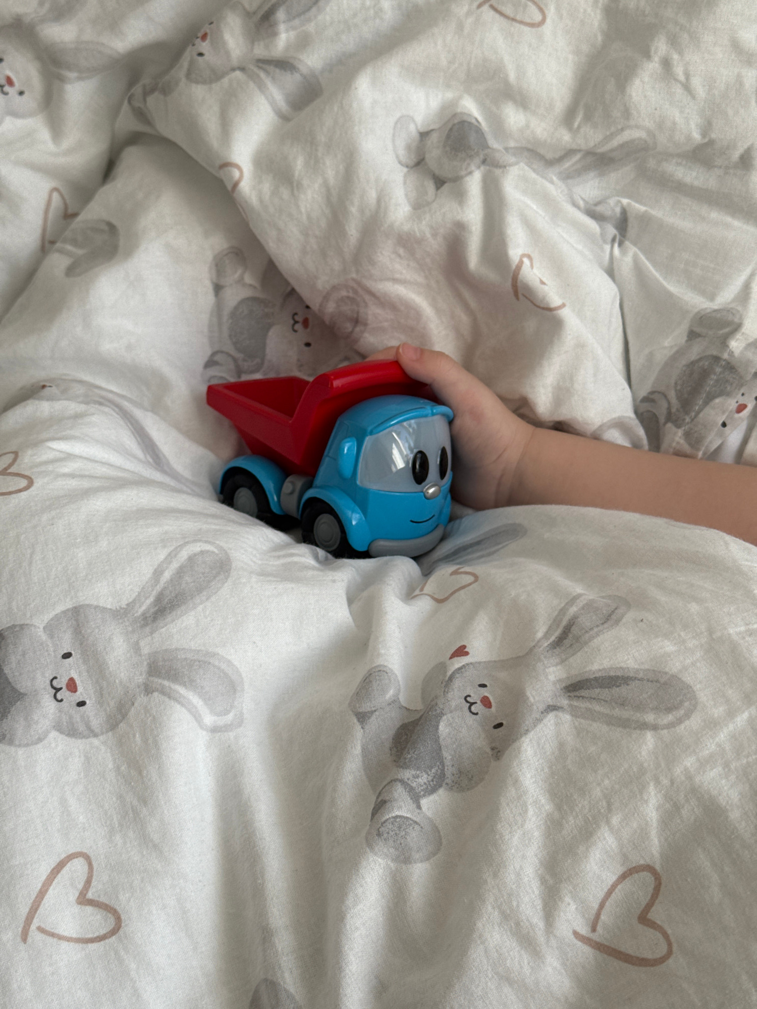 A child's hand holds a blue and red toy car on a white duvet cover with grey rabbit and beige heart patterns. The scene appears to be indoors. There is no evidence to indicate this image was taken in…read more