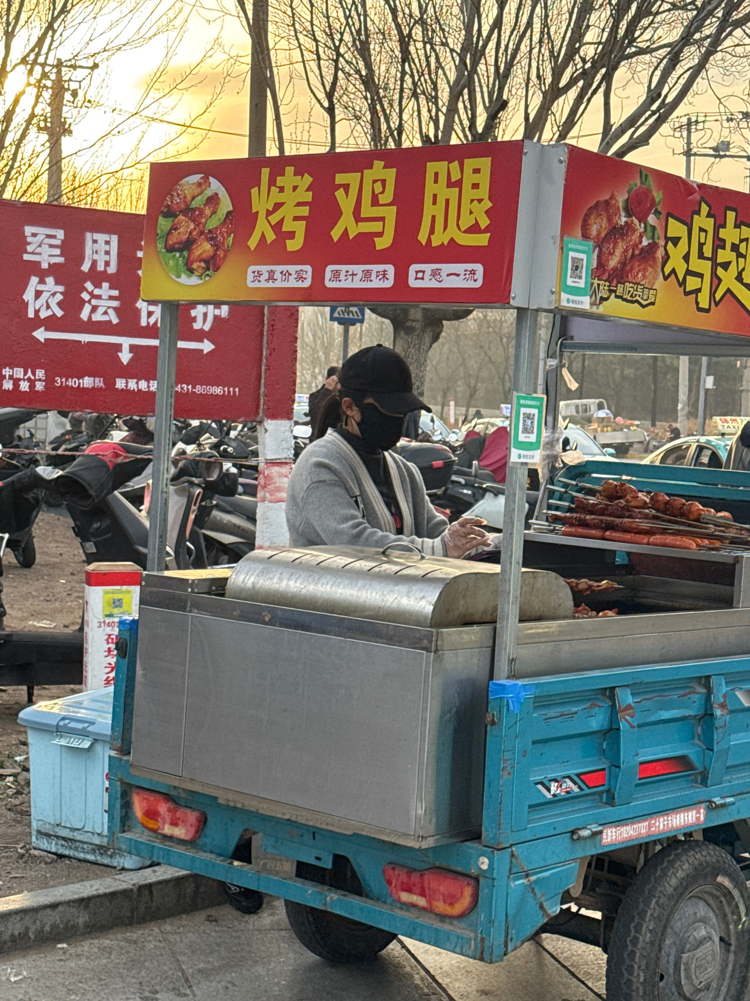 The image shows a street food vendor in Zhongtun, China, selling grilled chicken legs. The vendor is a person wearing a mask, a grey hoodie, and a black hat. The food cart is a blue, three-wheeled veh…read more