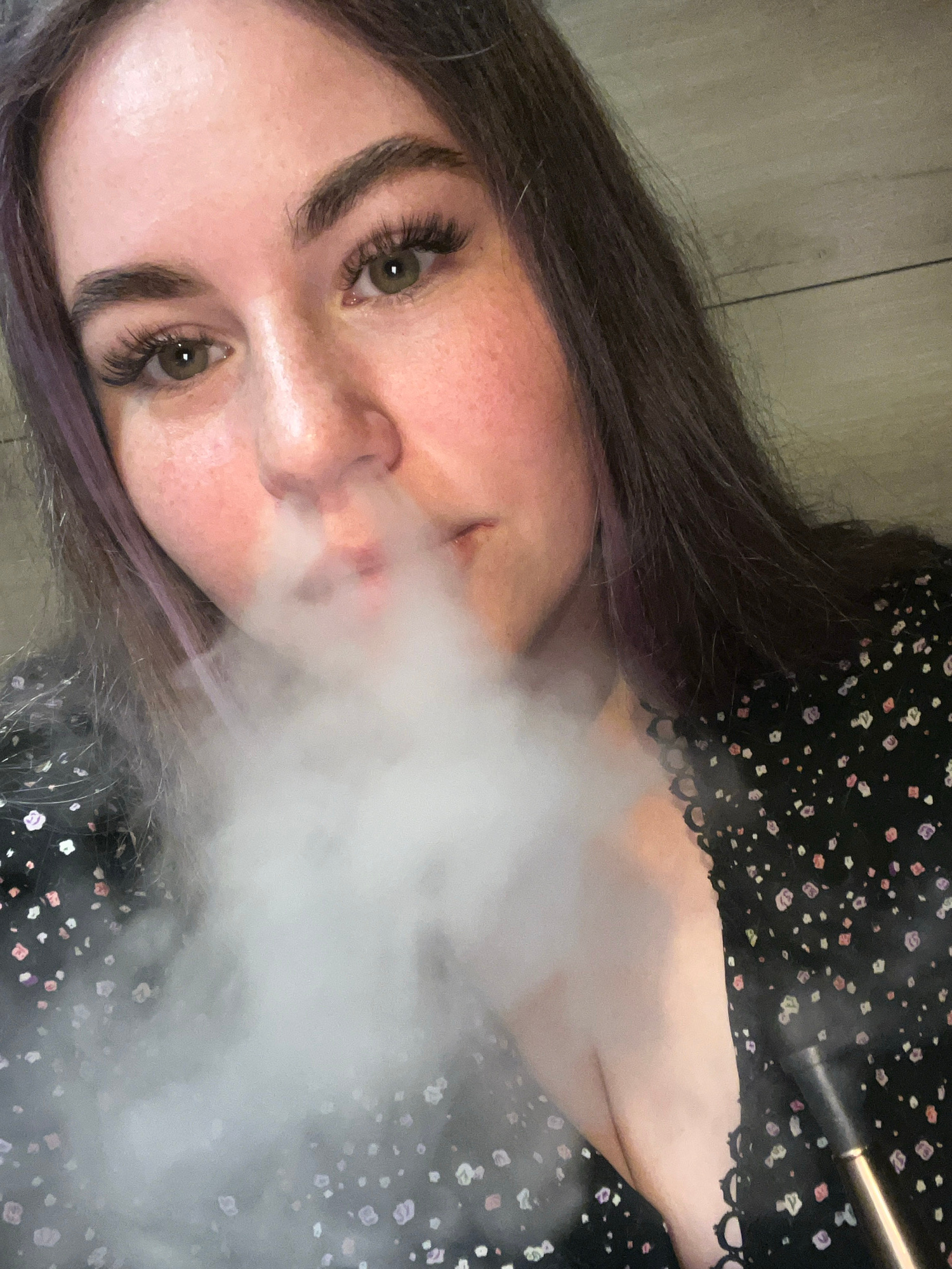 A young woman lies on a wood floor, exhaling a large cloud of vapor. She has fair skin, hazel eyes with long eyelashes, and dark brown hair with purple highlights. She wears a black dress with a small…read more