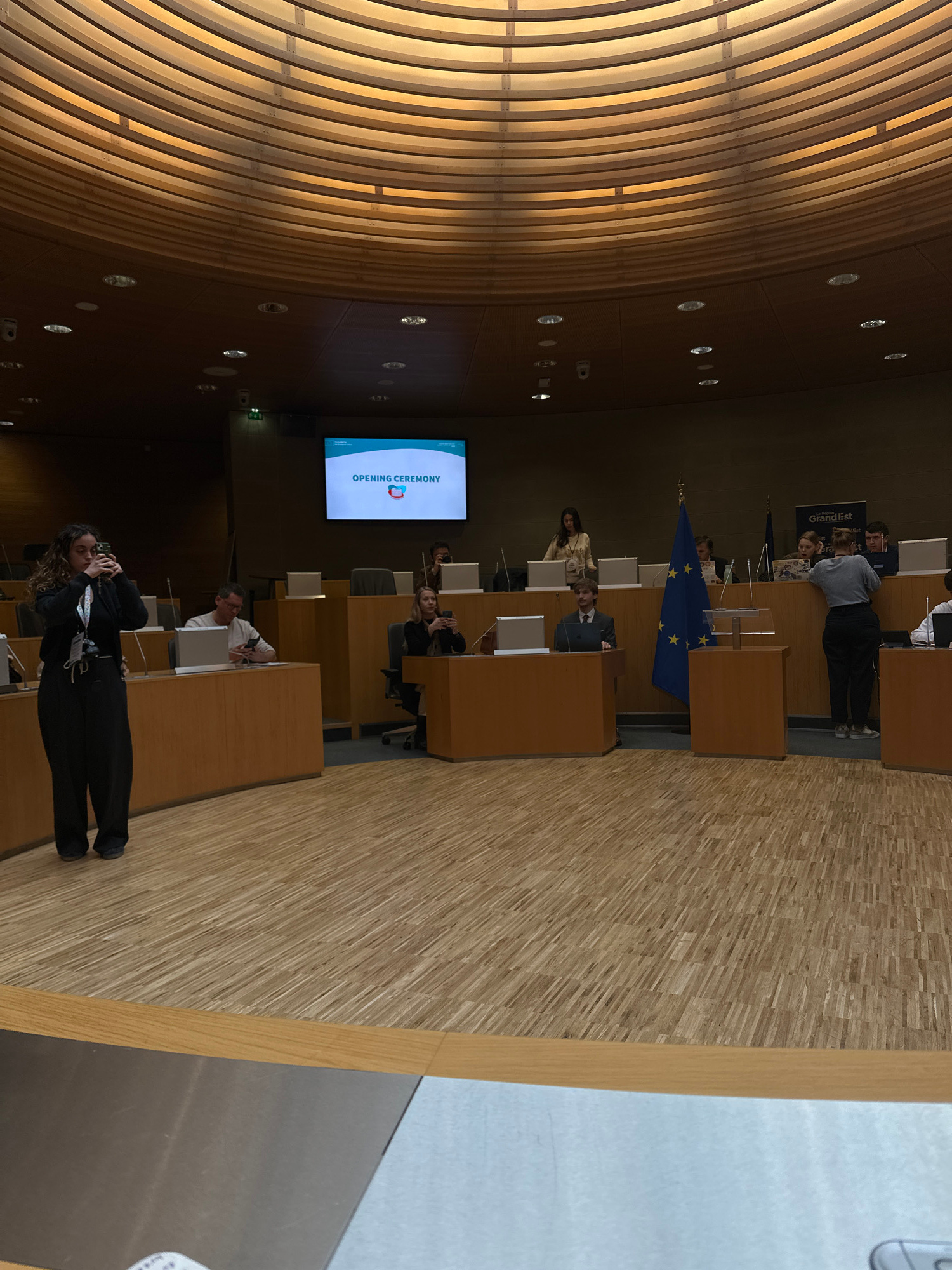 The image shows the interior of the European Parliament in Strasbourg, France. The chamber has a distinctive wooden ceiling with curved, parallel beams. Rows of desks and chairs face a central podium.…read more