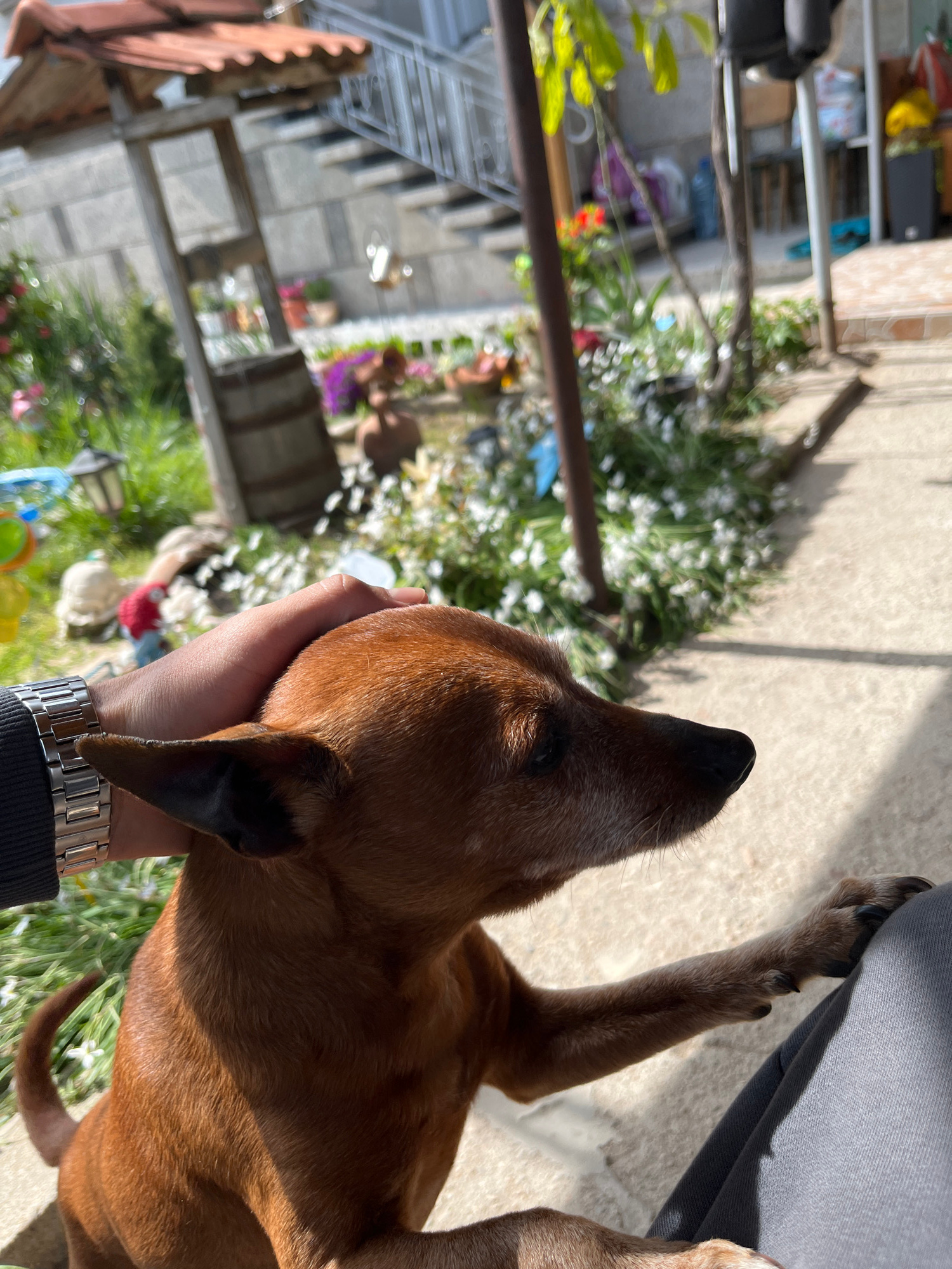 A close-up, angled shot depicts a brown dog being petted by a person wearing a silver wristwatch and a dark-colored jacket. The dog's head is tilted upwards, and its ears are visible. The person's han…read more