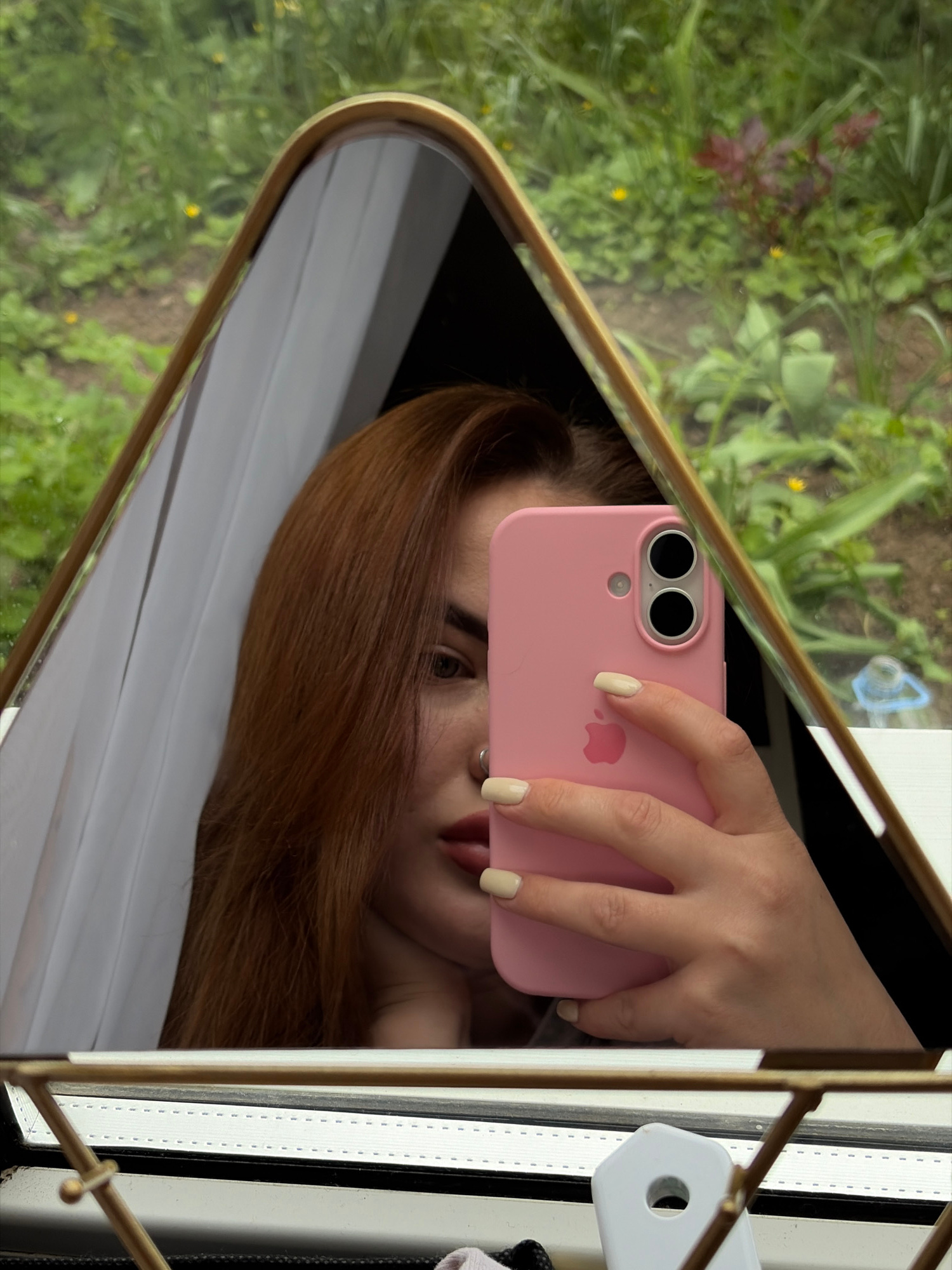 The image shows a person taking a selfie in a mirror. The person is holding a pink iPhone, and their face is partially visible. They have light skin, brown hair, and are wearing a nose ring. The mirro…read more