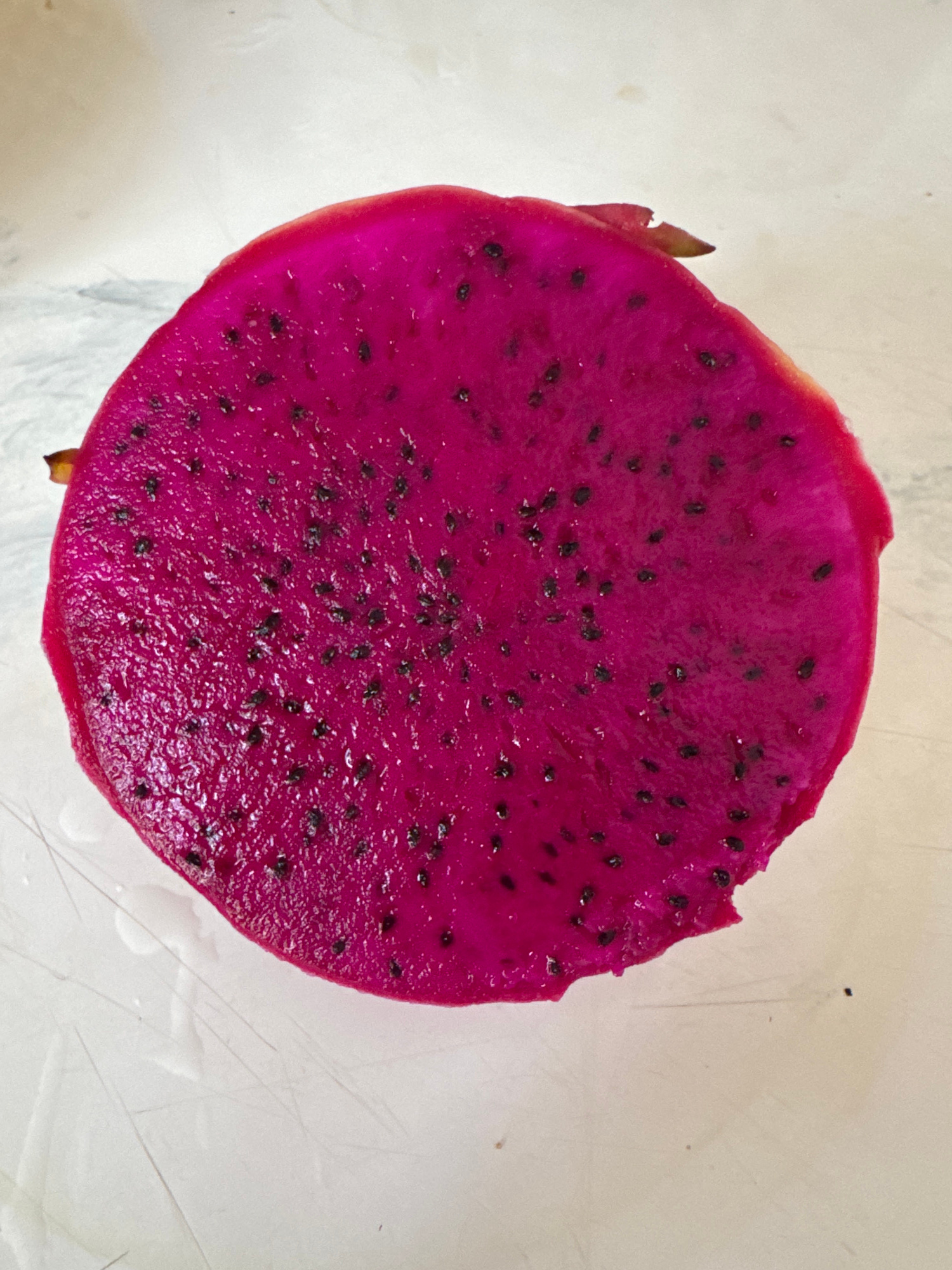 The image shows a cross-section of a vibrant pink dragon fruit with numerous small black seeds embedded within the pulp. The fruit appears freshly cut, with a slightly uneven edge suggesting it was li…read more