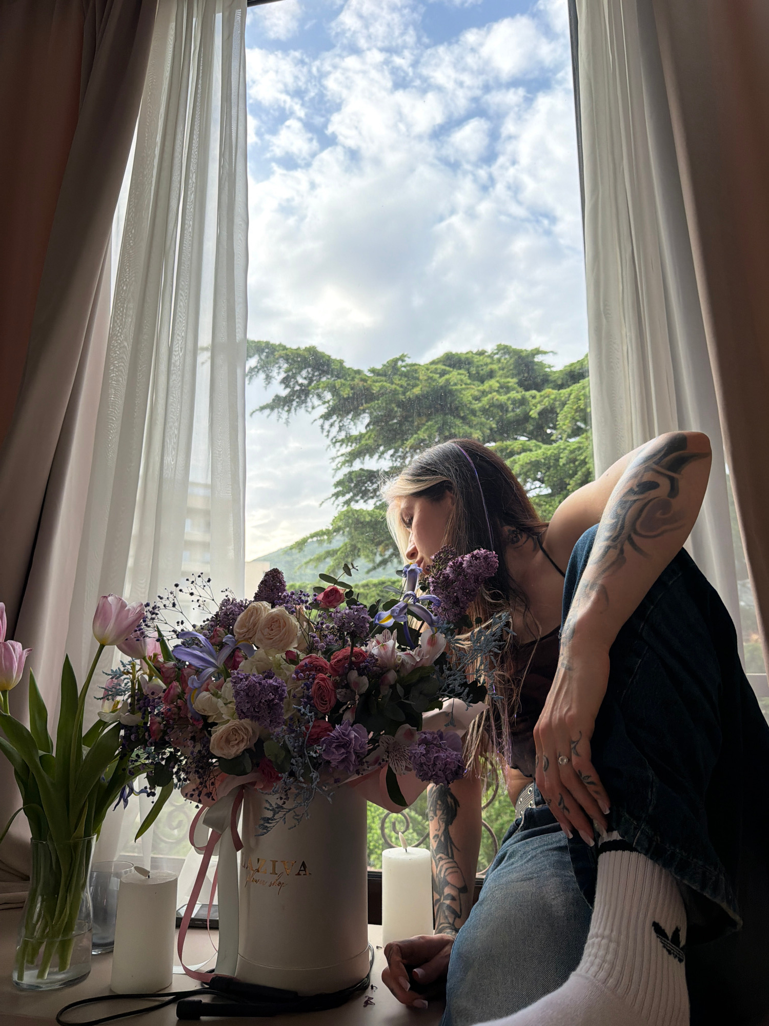 The image portrays a serene indoor scene by a large window, centered around a young woman admiring a vibrant floral arrangement. The woman, positioned to the right, has long dark hair with lighter str…read more