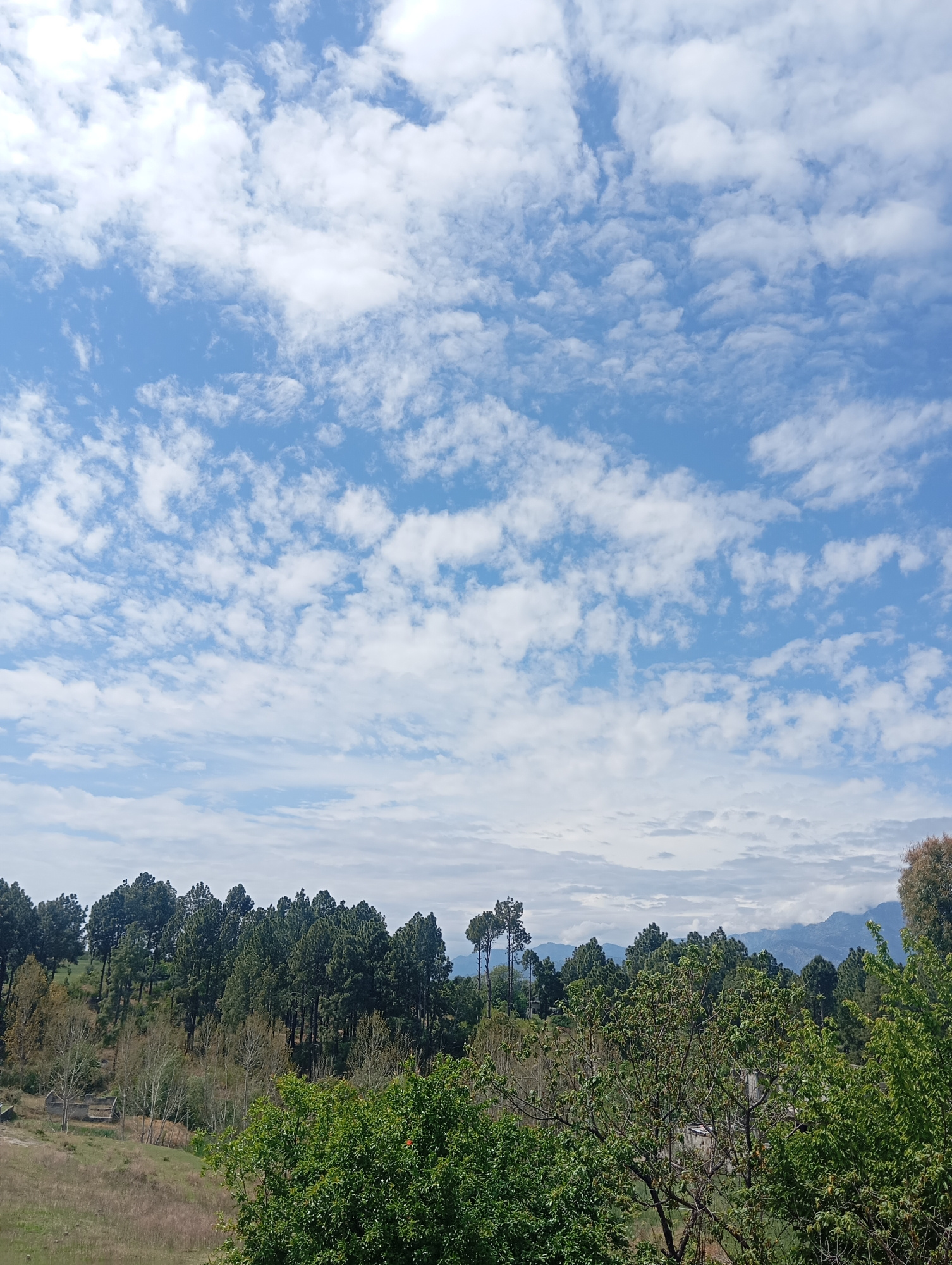 The image depicts a landscape in Lassan, Pakistan, under a partly cloudy, blue sky. The foreground features green trees and shrubs. A sloping field with dry grass leads up to a dense forest of conifer…read more