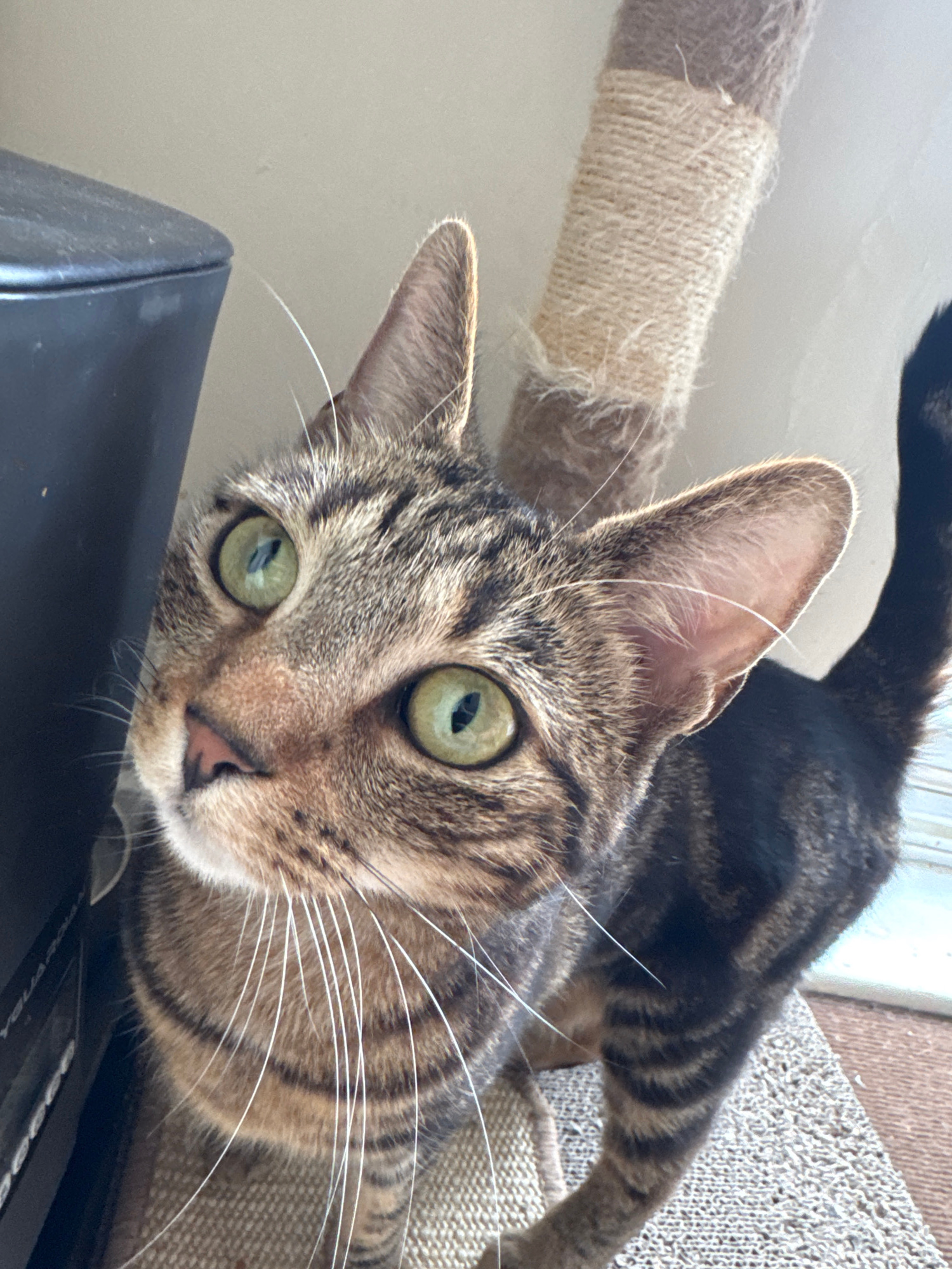 A tabby cat with green eyes peers down at the camera from atop a black electronic device. The cat has dark brown stripes and white whiskers. Part of a scratching post, wrapped in tan rope and carpet,…read more
