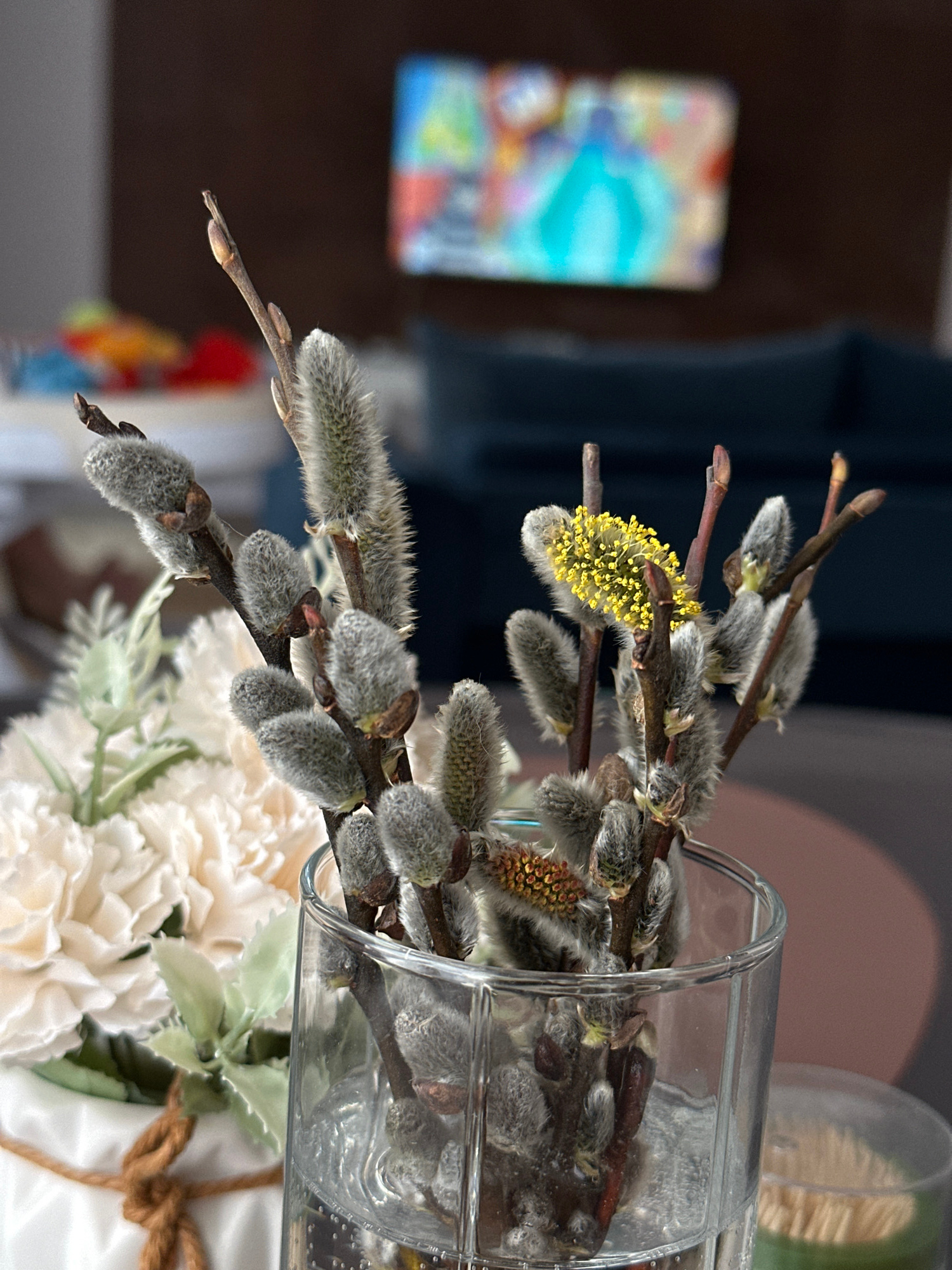 A still-life photograph shows pussy willow branches arranged in a clear glass vase. Some of the branches have begun to flower with yellow catkins. The vase is part of a larger floral arrangement that…read more