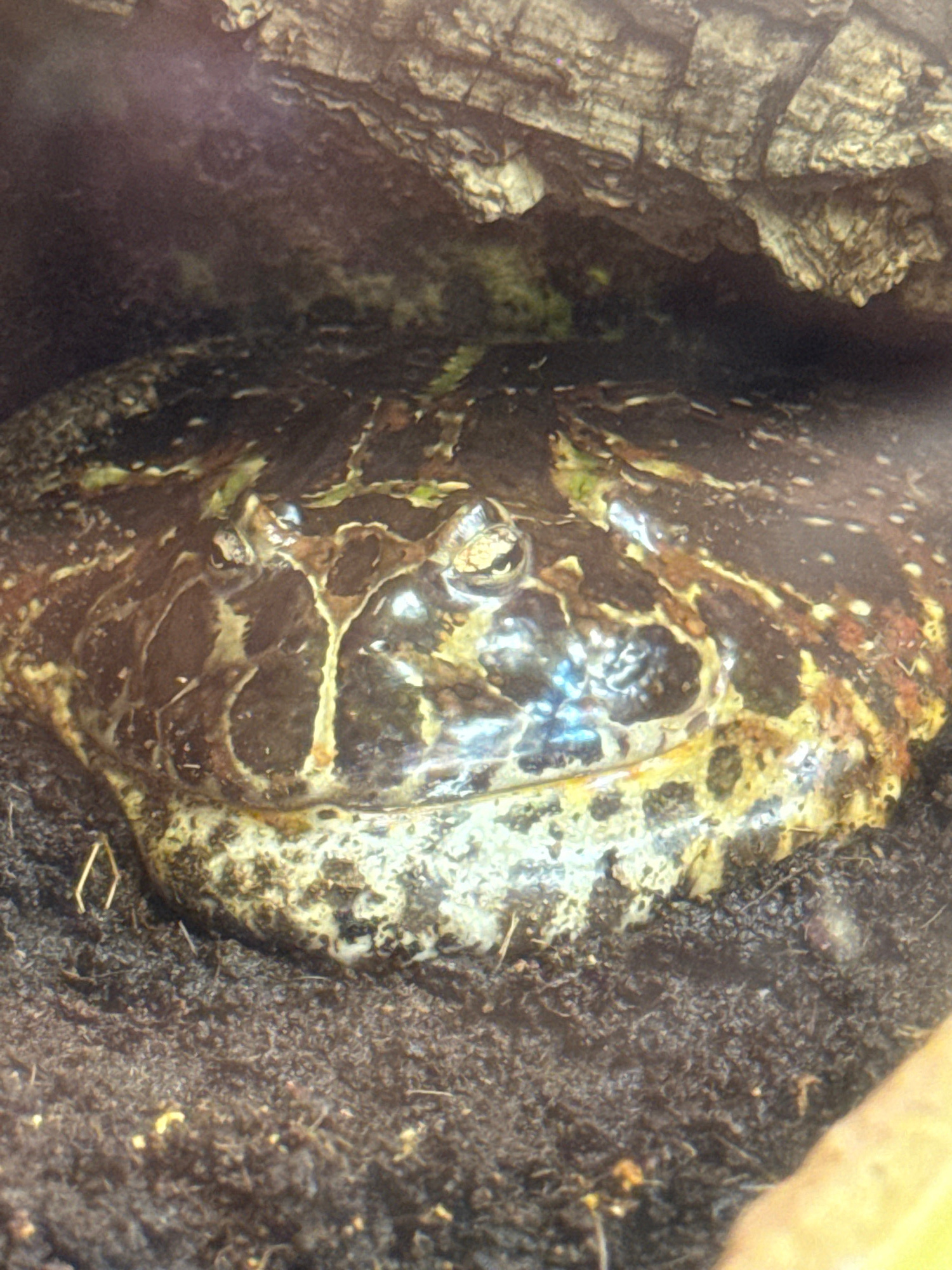 A frog with black and yellow markings sits partially hidden in a dark, earthy environment. The frog's eye is visible, and its skin appears moist. To the left, there is a piece of textured, grey bark.…read more