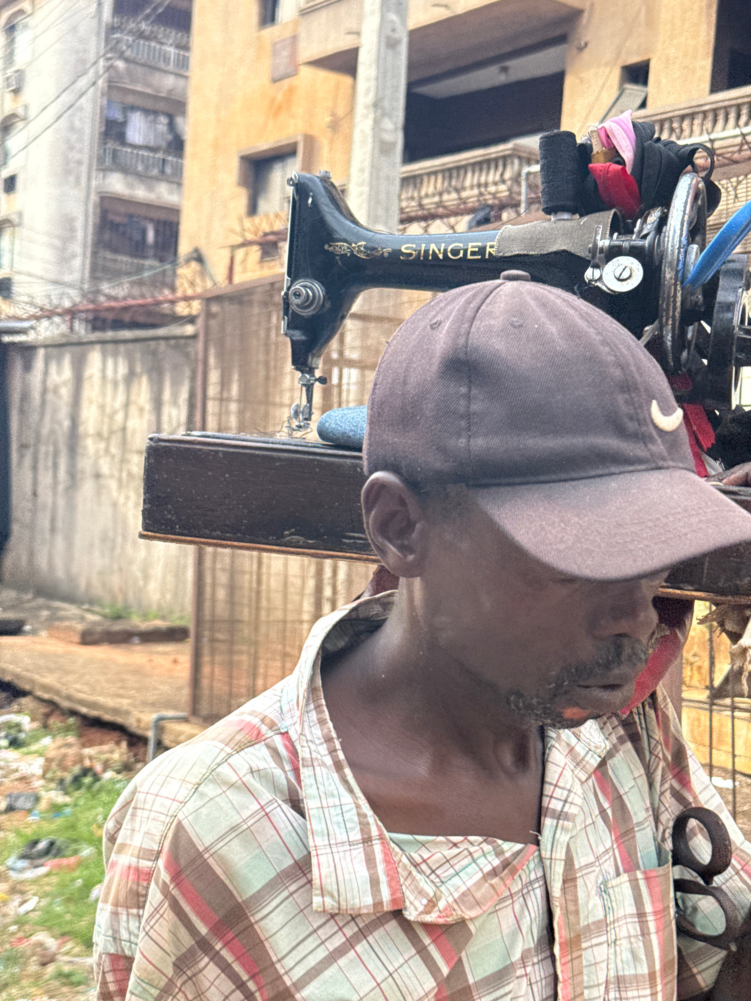 A man wearing a brown cap and plaid shirt sits at a black Singer sewing machine. The scene is likely located in Onitsha, Nigeria, based on visual cues. The background includes buildings and an alleywa…read more
