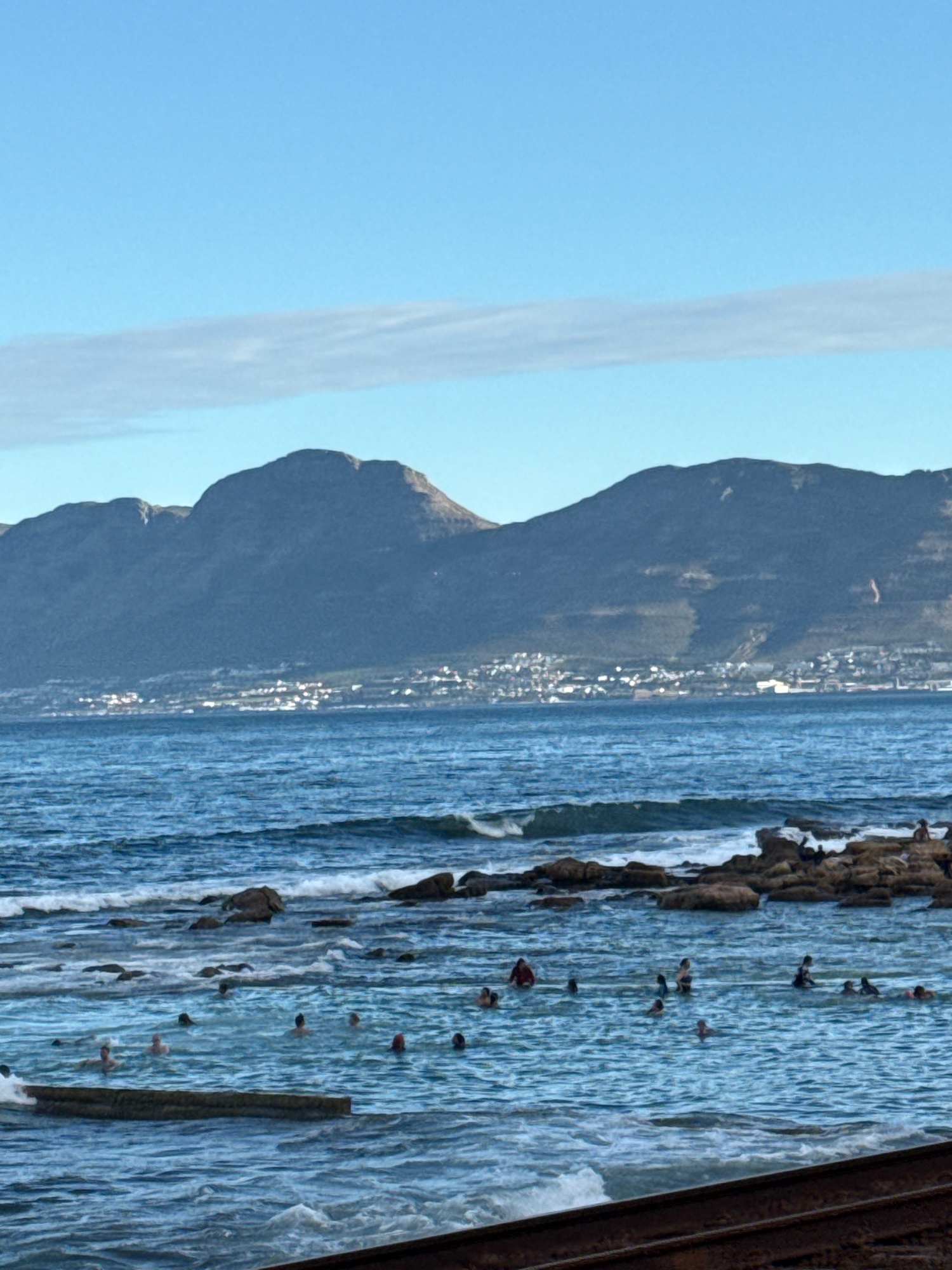 The image shows a coastline scene with a view of a mountain range, likely taken in Cape Town, South Africa, specifically featuring Table Mountain. The sky is clear with some linear cloud formation. Thβ¦read more