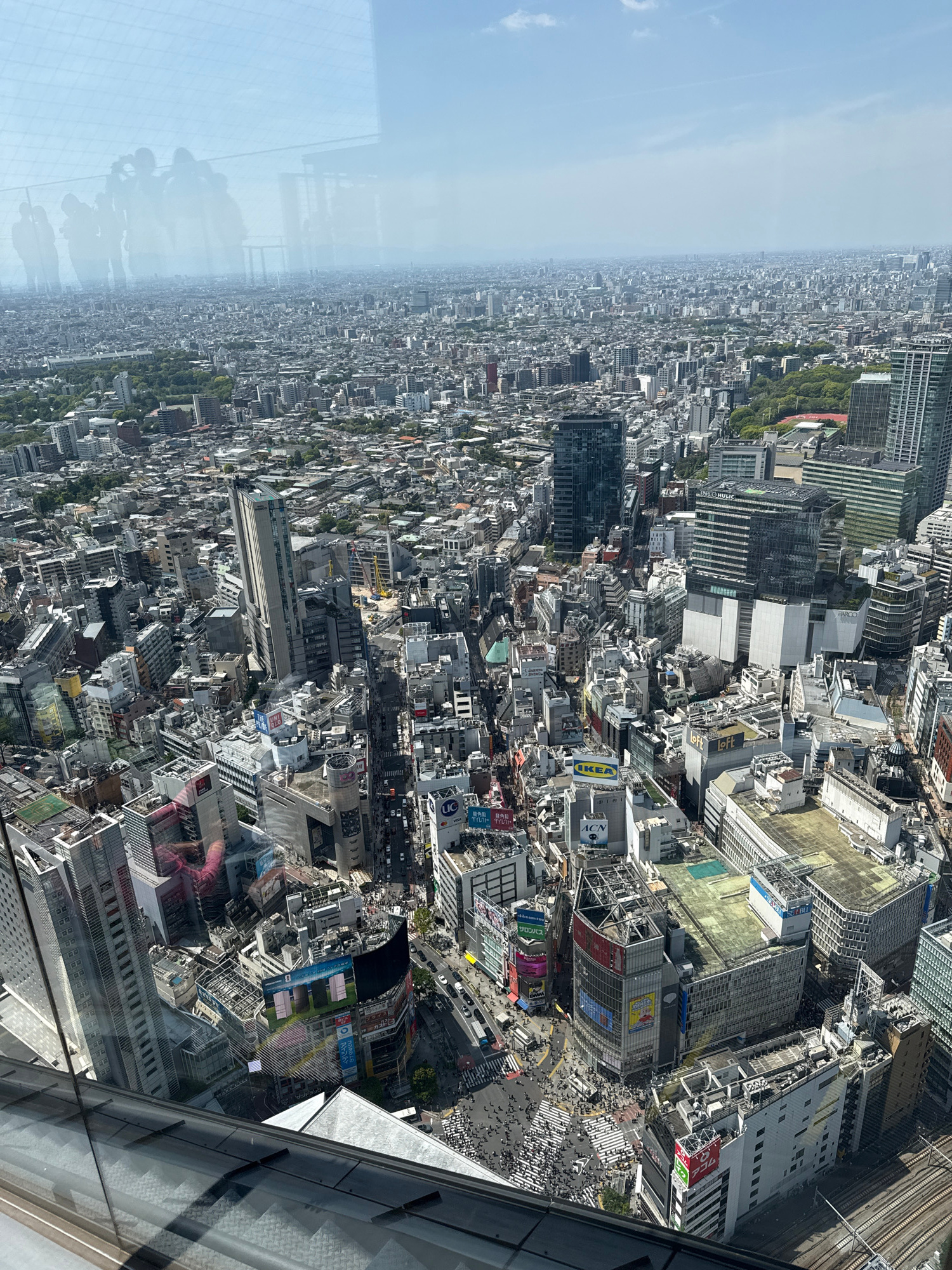 The image shows an aerial view of Shibuya, Japan, from a high vantage point, likely a skyscraper observation deck. The dense urban landscape is filled with numerous buildings of varying heights and ar…read more