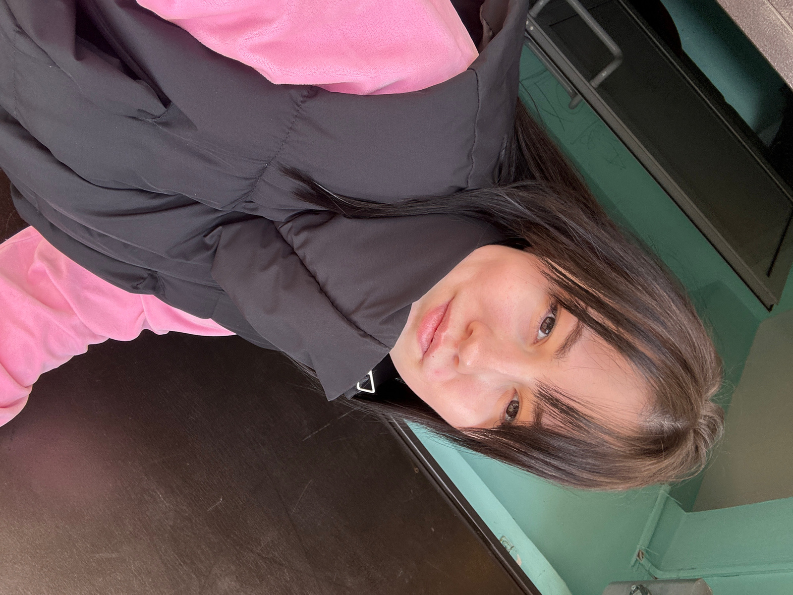 A young woman with brown hair and a pink sweater is wearing a black puffer vest. She is indoors, likely in the city of Chaikovsky, Russia. The background features a green wall and a dark door frame. T…read more