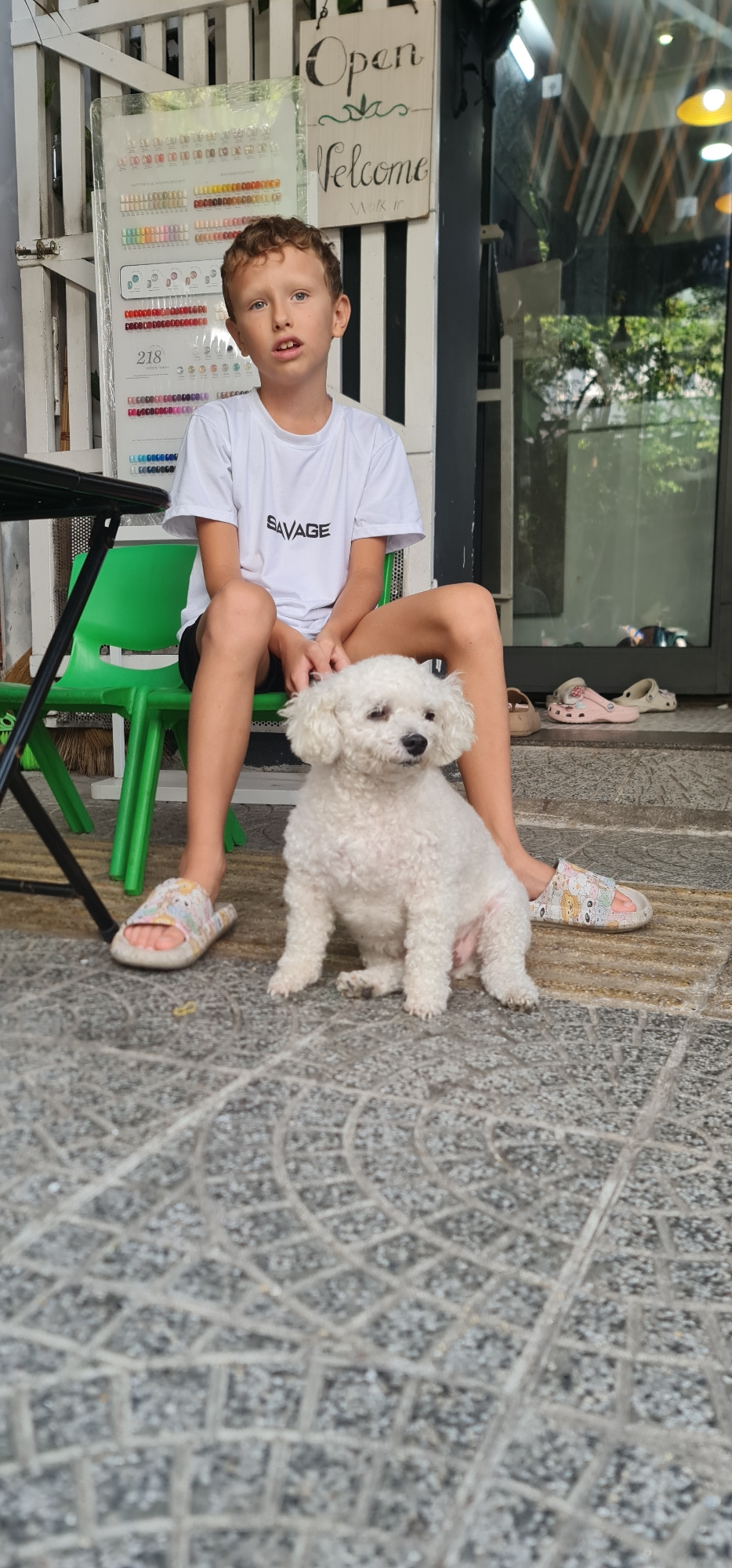 A boy in a white "SAVAGE" t-shirt sits on a green chair outside a shop in Đà Nẵng, Vietnam. He holds a small, white, fluffy dog on his lap. Both are facing forward. The boy has curly, light brown hair…read more