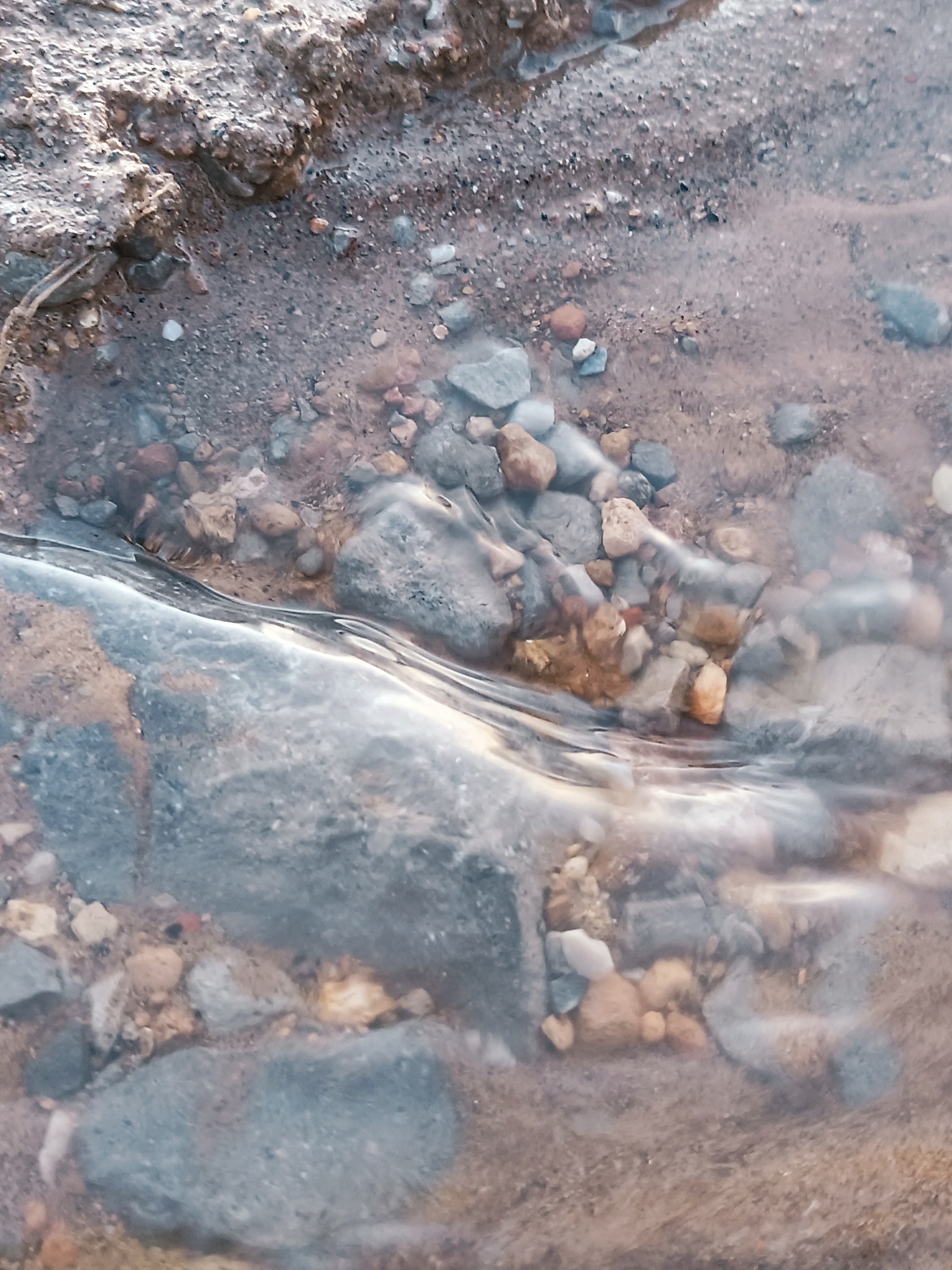 The image shows a close-up view of a small stream or shallow body of water near Большие Ошворцы, Russia. The water flows over and around a variety of rocks and pebbles, both large and small. The strea…read more